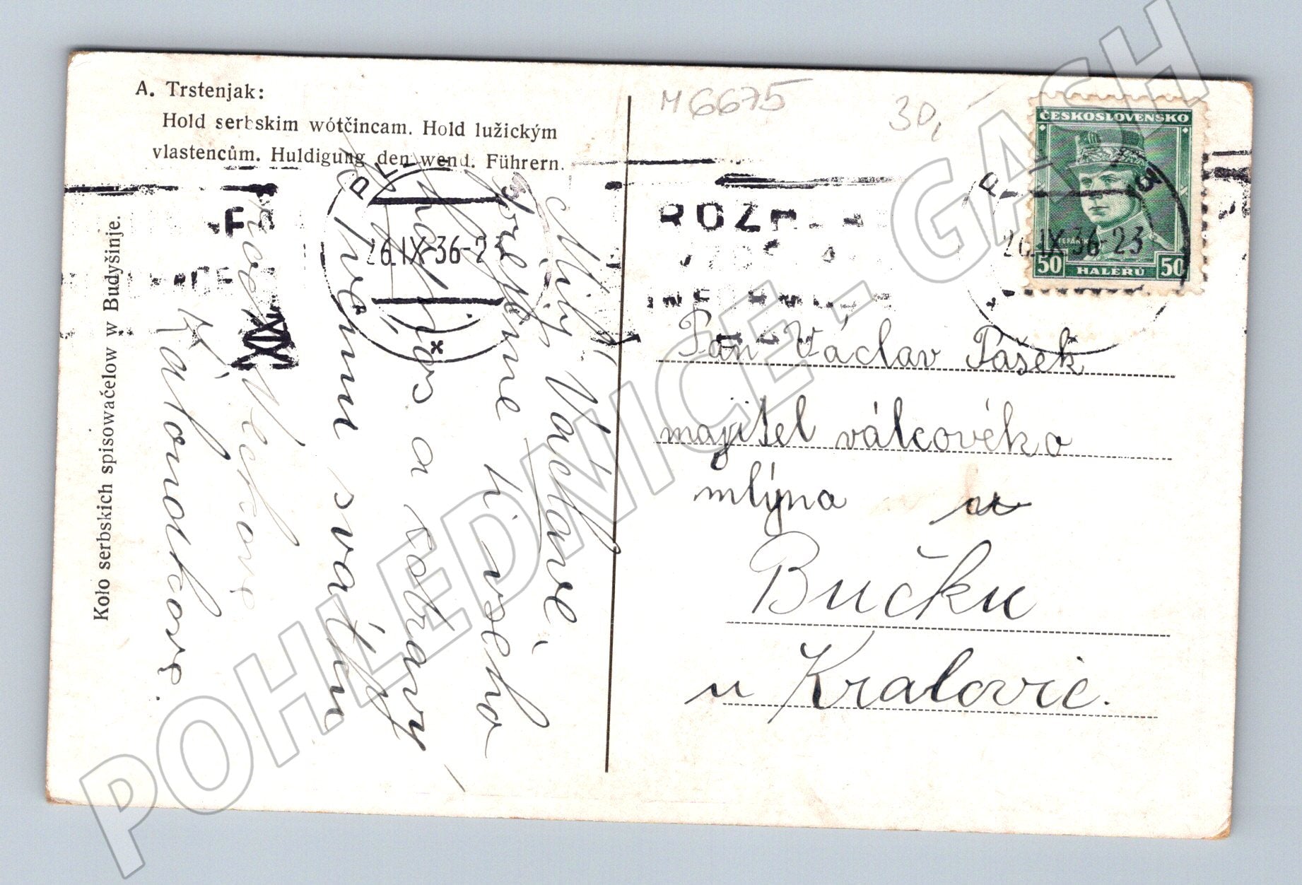 Etnografická pohlednice – Lužičtí Srbové v krojích, slavnost, pošta 1936