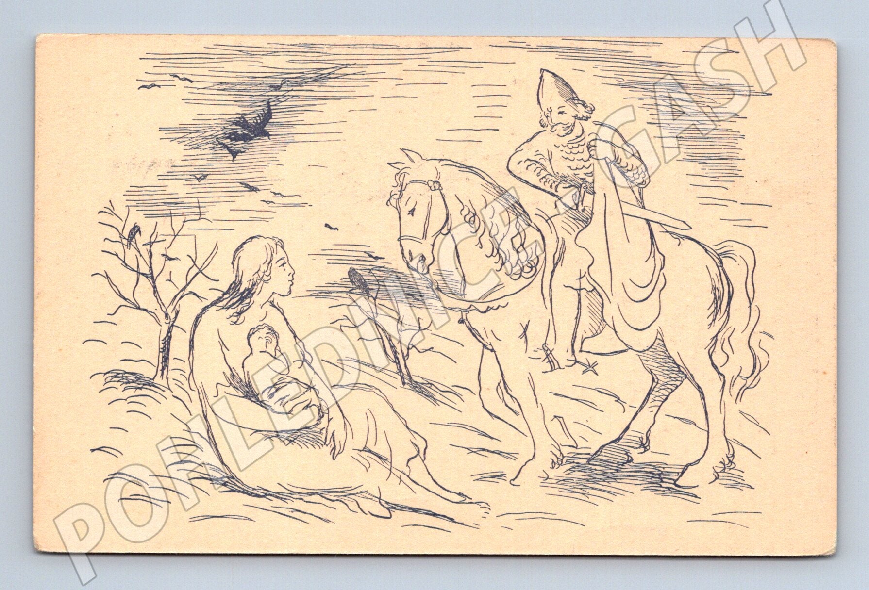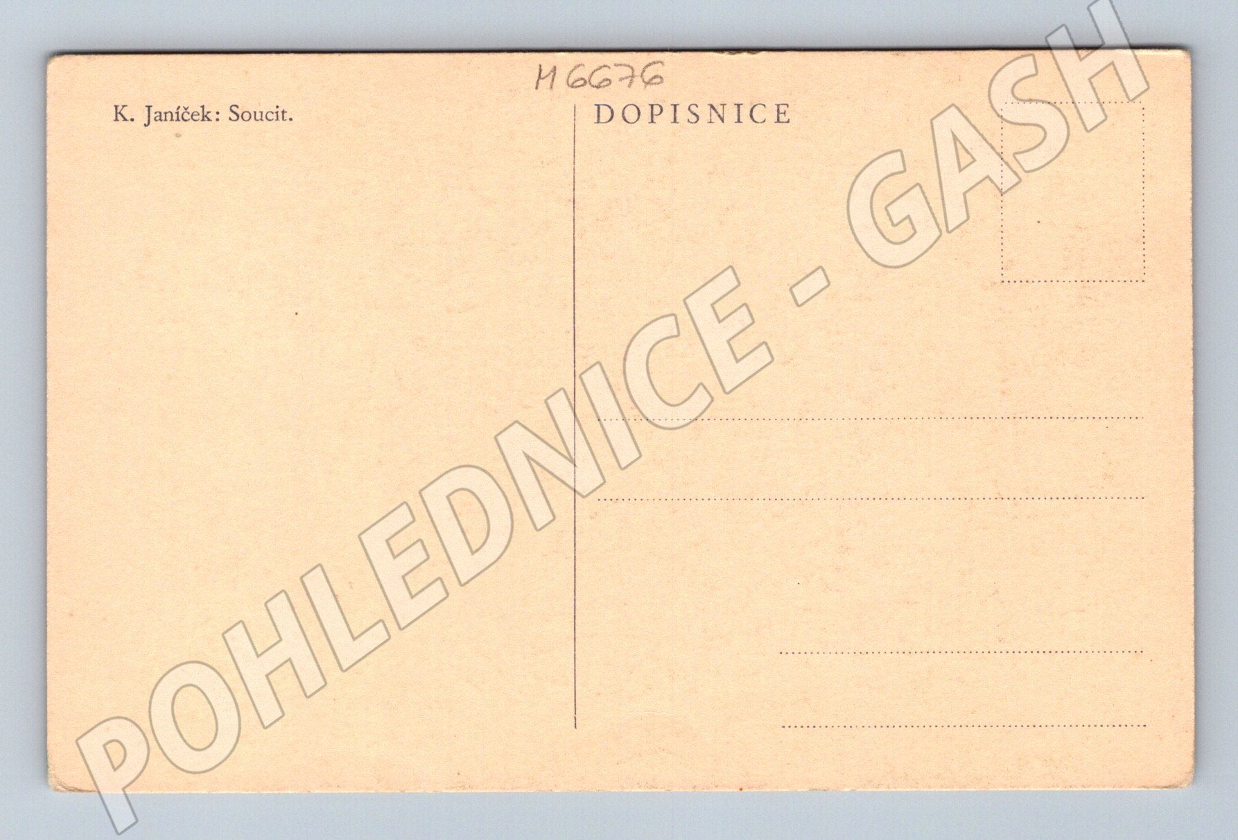 Originální pohlednice s názvem Soucit od autora K. Janíčka. Na přední straně je umělecká kresba zobrazující jezdce na koni, který se zastavil u ženy s dítětem v náručí. Výjev má hluboký citový podtext a reflektuje soucit a lidskost v nelehkých podmínkách. Pohlednice je neprošlá, ve velmi dobrém stavu, bez nápisů či přání. Vhodná pro sběratele malířských pohlednic nebo milovníky umění slova a obrazu. Zadní strana s označením DOPISNICE, vlevo název a autor díla. Rozměr klasického formátu. Skvělý kousek do sbírky historických pohlednic s uměleckým zaměřením.