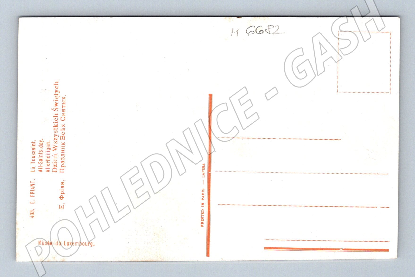 Nabízím sběratelskou pohlednici s reprodukcí obrazu francouzského malíře Emila Frianta, nazvaného La Toussaint / All Saints Day / Dušičky / Dzień Wszystkich Świętych / Праздник Всех Святых . Pohlednice zachycuje melancholickou scénu smutečního průvodu a ženy v černém, typické pro období Dušiček. Vlevo sedí starší žena s rámečkem fotografie, v pozadí je zasmyřený hřbitov. Jemná barevnost a detailní malba vystihují atmosféru i emoce tohoto svátku vzpomínek. Na zadní straně najdete popis v několika jazycích a lokalizaci Musée du Luxembourg. Pohlednice je bez známky a bez zápisu, ve výborném stavu, ideální pro sběratele tematických a uměleckých pohlednic.