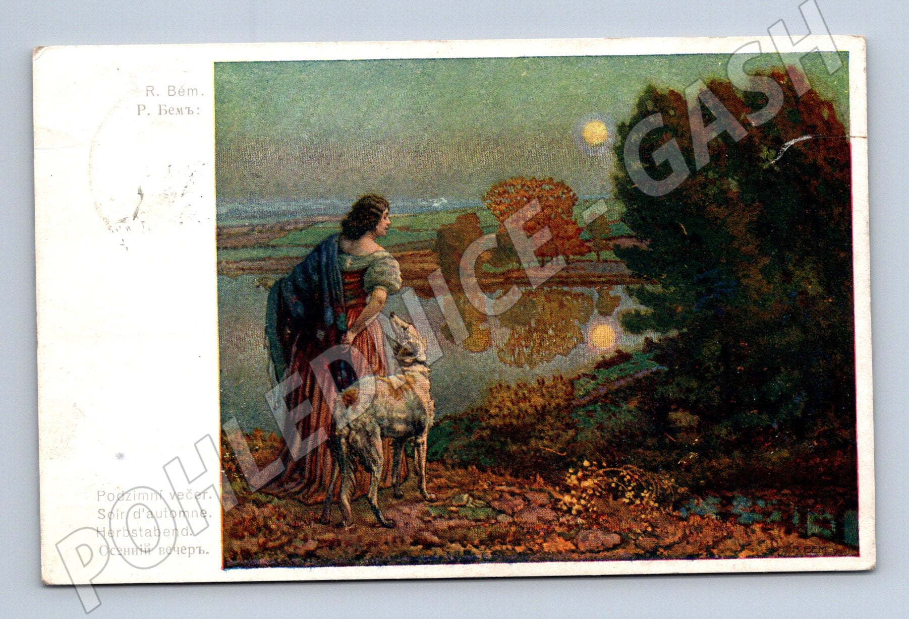 Originální stará pohlednice s názvem Podzimní večer od autora R. Bém, vydaná nakladatelstvím Minerva Praha. Pohlednice zachycuje malebnou večerní podzimní scenérii s postavou ženy, dítěte a psa u klidného jezera v podzimní krajině při východu měsíce. Motiv je tištěn v jemných barvách s krásnými detaily přírody a odrazem měsíce ve vodě. Pohlednice byla odeslána poštou – na zadní straně je dochována známka Františka Josefa I. a ručně psaný text adresovaný do Sezemic. Ve velmi dobrém sběratelském i vizuálním stavu, pouze s drobnými stopami stáří na rozích. Jedná se o cenný přírůstek do sbírky historických pohlednic z území ČR z období před rokem 1950.