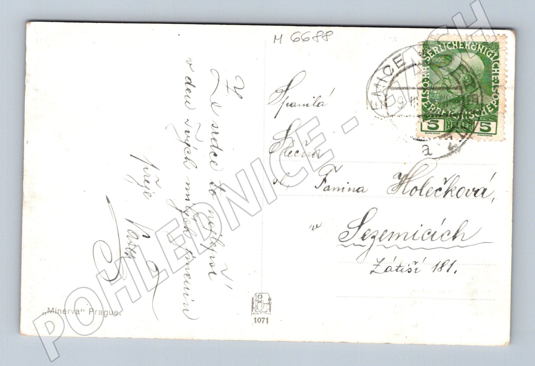 Podzimní večer – stará pohlednice R. Bém, Minerva Praha, prošlá poštou