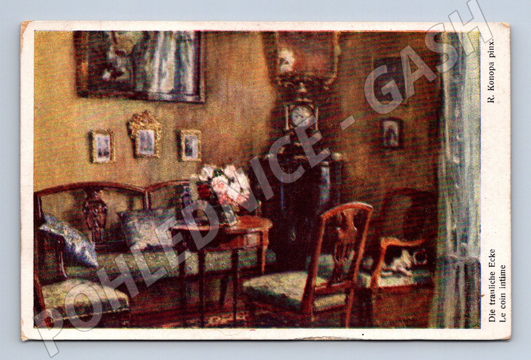 Nabízím originální starou pohlednici se zobrazením útulného interiéru, ve kterém je na pohovce u okna vidět kočka. Pohlednice zachycuje elegantně zařízený obývací pokoj s květinovým aranžmá na stole, starožitnými obrazy a hodinami na stěně. Autor motivu je R. Konopa. Pohlednice byla zaslána poštou, je opatřena známkou a rukopisným textem. Celkový stav je velmi dobrý vzhledem ke stáří – mírné opotřebení hran. Skvělý sběratelský kousek pro milovníky koček i starých interiérů.