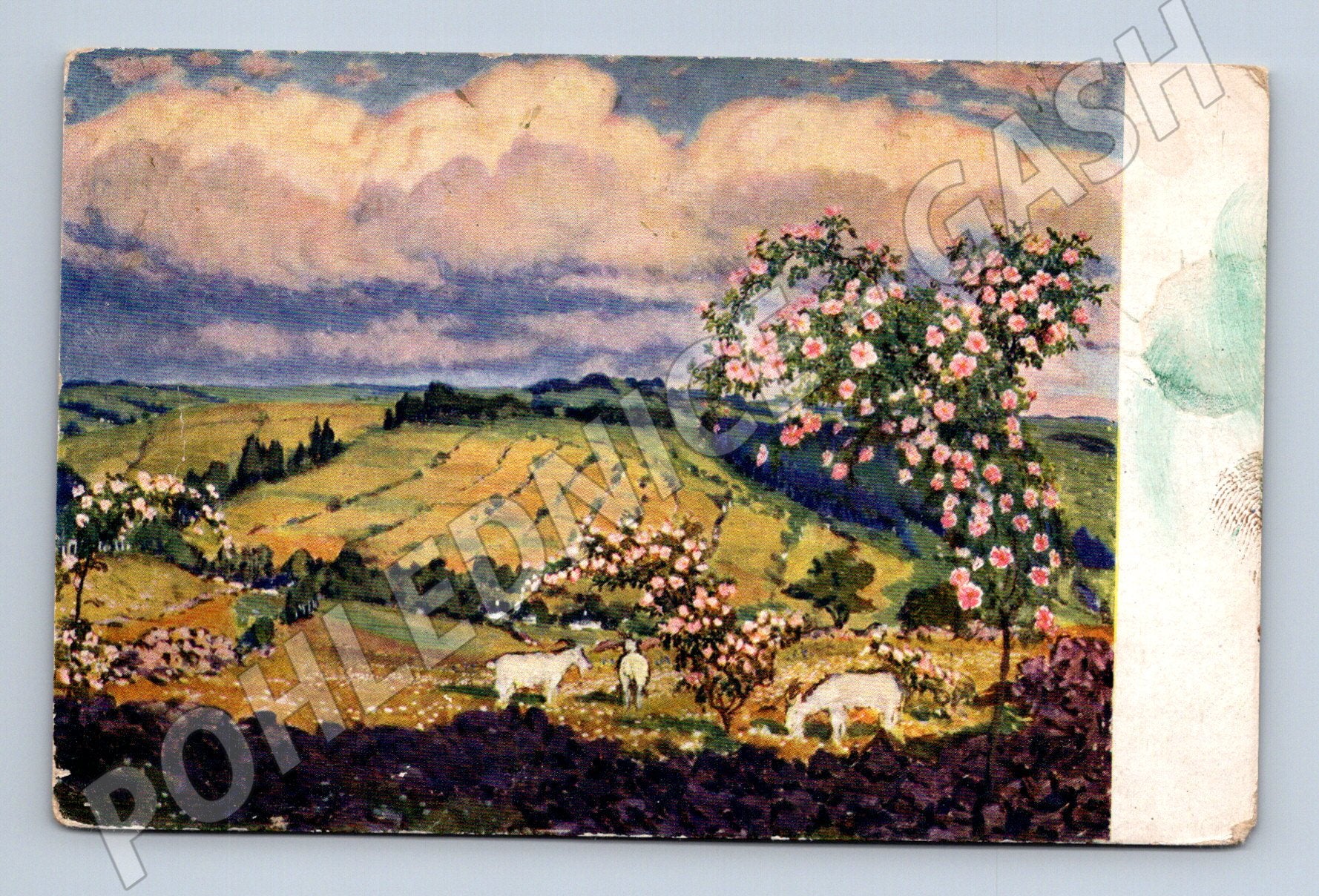 Nabízím starou pohlednici s malovaným motivem krajiny. Pohlednice zobrazuje malebnou venkovskou scenérii s rozkvetlými stromy, kopcovitým terénem a pasoucími se ovcemi. Krásné barevné provedení a jemné detaily ilustrace. Pohlednice pochází od vydavatele Minerva Praha, číslo 742-1. Zadní strana pohlednice je nepopsaná, nese pouze drobné známky stáří a ušpinění, stopy manipulace jsou patrné na okrajích. Ideální pro sběratele pohlednic s tématem malířství, krajinářství a starých ilustrací.