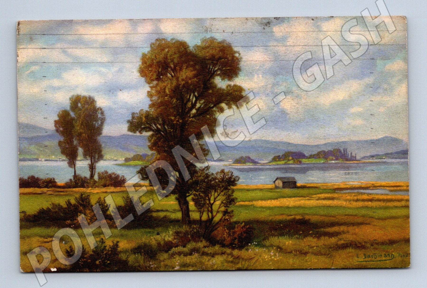 Nabízím sběratelskou pohlednici se scenérií švýcarského jezera Zürichsee s ostrovem Lützelau. Pohlednice zachycuje malebnou krajinu s jezerem, stromy a horským pozadím, malba od L. Sachse. Na zadní straně je štítek No. 441 Zürichsee mit Lützelau a značka vydavatele. Stav: starší pohlednice, drobné stopy opotřebení (viz foto), neprošlá poštou. Ideální pro sběratele pohlednic s motivy Švýcarska a přírody.