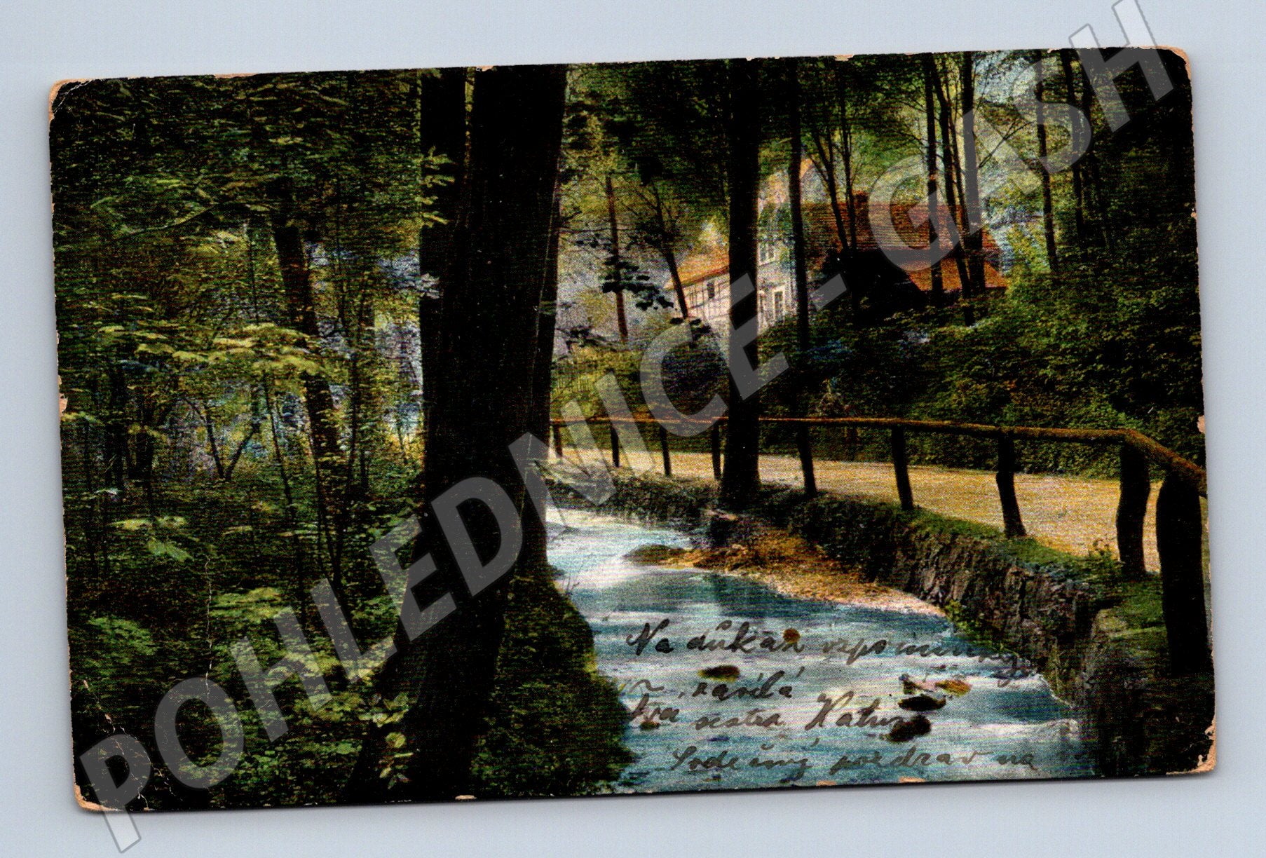 Starobylá pohlednice z českého prostředí, malý formát do roku 1950. Motivem je malebná říčka lemovaná stromy a lávka či cesta vedoucí podél vody, v pozadí viditelný dům či chata. Pohlednice je ručně popsána s odeslanou známkou (5 hellerů) a razítkem. Na zadní straně je adresována slečně Vilímce Machkové do Prahy. Jedná se o typickou sběratelskou záležitost z období Rakouska-Uherska, vhodnou pro milovníky starých pohlednic či regionální historie. Mírné známky opotřebení na rozích.