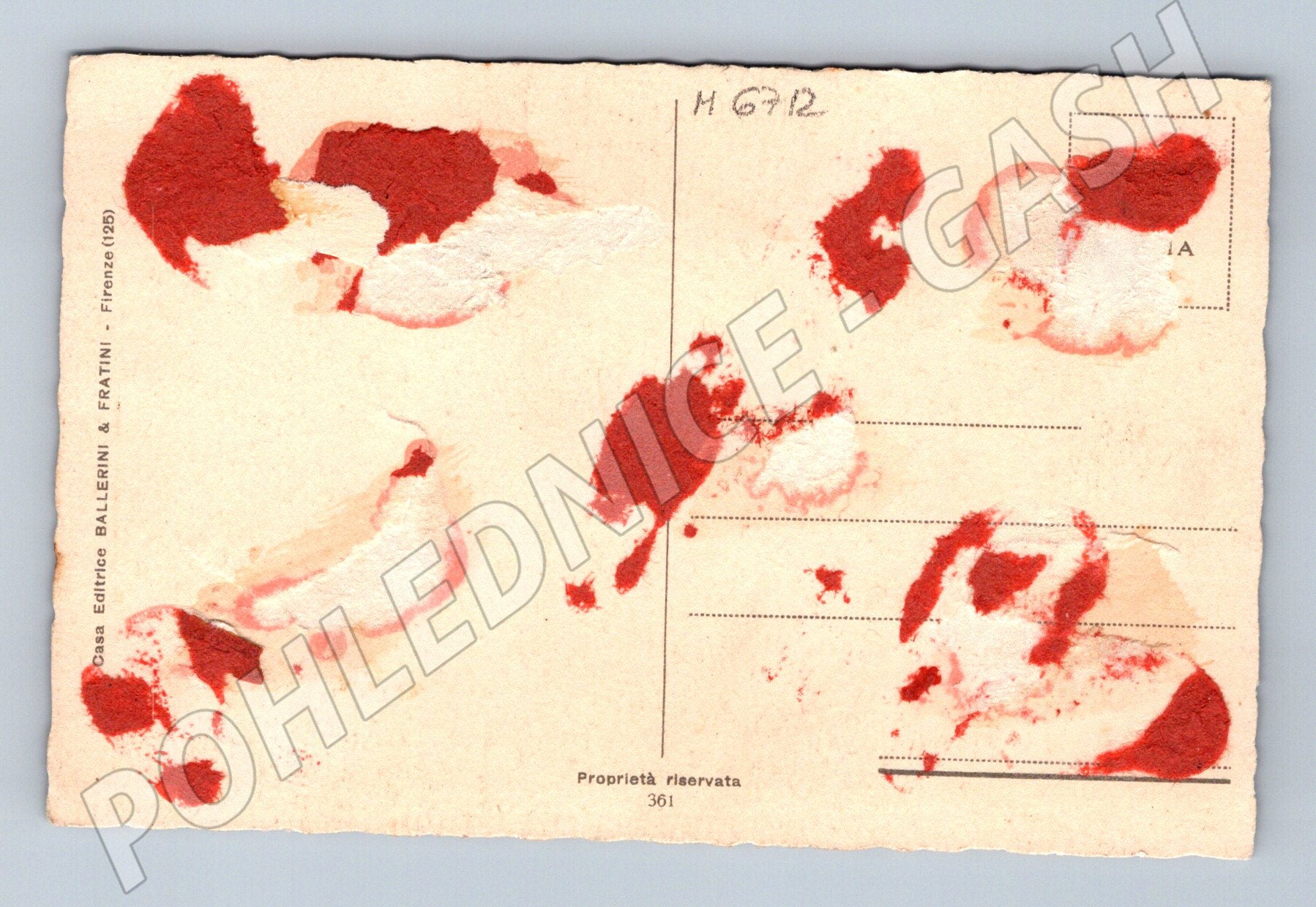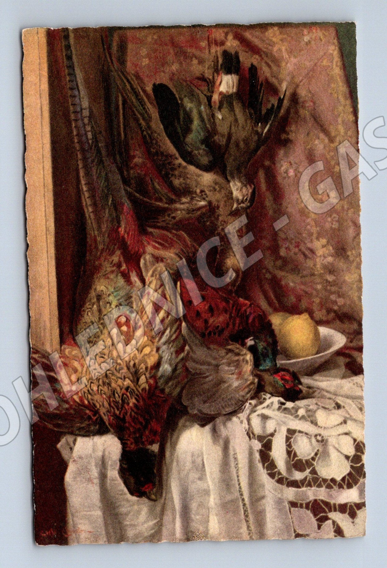 Nabízím starou uměleckou pohlednici s motivem zátiší se zabitými ptáky (bažant, holub) na luxusní látce a polštáři. Jedná se o reprodukci malířského díla ve stylu zátiší, vydanou italským vydavatelstvím Casa Editrice Ballerini & Fratini, Firenze. Pohlednice má po okrajích drobné známky stáří a zadní strana nese zřetelné stopy původního vlepení či barevných skvrn. Vhodné pro sběratele zátiší, pohlednic se zvířaty či milovníky starých pohlednic. Formát cca 9x14 cm.