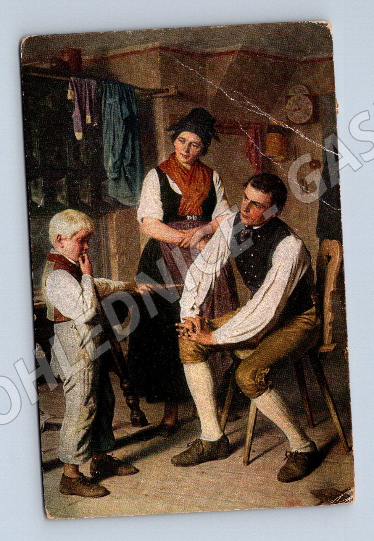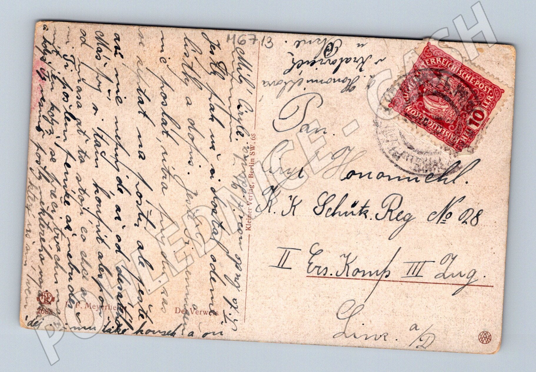 Starobylá pohlednice s malovaným motivem zachycujícím rodinnou nebo vesnickou scénu v interiéru, pravděpodobně z přelomu 19. a 20. století. Jedná se o barevnou tištěnou pohlednici s náznaky etnografických prvků na oblečení postav. Pohlednice byla odeslána a je vyplněna ručně psaným textem na zadní straně. Vytištěné označení nakladatele Kleiner Verlag, Berlin SW 68 a známka Rakousko-Uhersko v hodnotě 10 heller, razítkovaná. Stav dle fotografií – viditelné opotřebení rohů a povrchové oděrky, v pravém horním rohu na přední straně mírné poškození. Výjimečný sběratelský kus vhodný do tématických i uměleckých kolekcí pohlednic.
