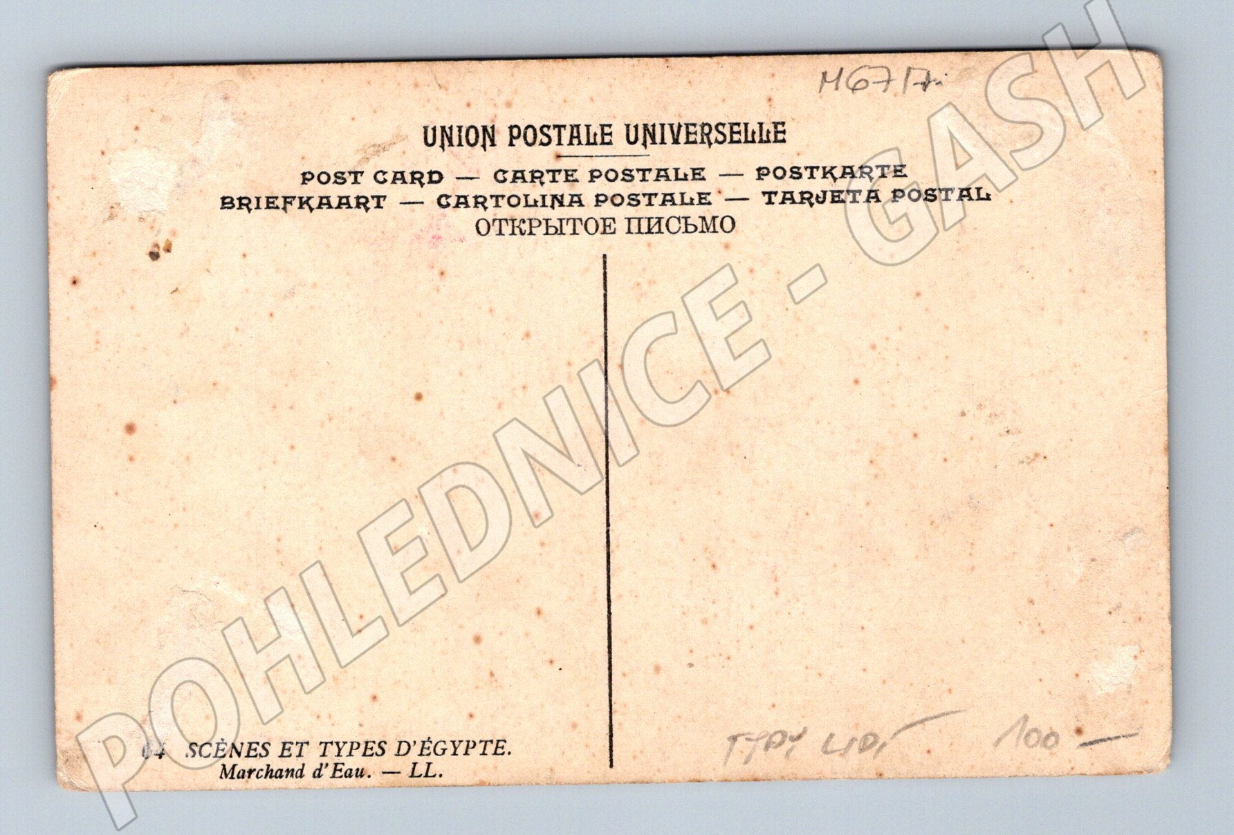 Originální historická pohlednice s názvem EGYPTIAN TYPES AND SCENES – A Water Seller znázorňuje egyptského prodavače vody v tradičním oděvu s nádobou na zádech. Jedná se o skvělý sběratelský kousek z edice SCÈNES ET TYPES D ÉGYPTE (Marchand d’Eau – LL.). Na zadní straně je univerzální potisk UNION POSTALE UNIVERSELLE určený ke korespondenci a adrese. Pohlednice nese znaky stáří – drobné známky opotřebení a zažloutnutí papíru. Ideální pro sběratele starých etnografických pohlednic a zájemce o historické motivy ze severní Afriky.
