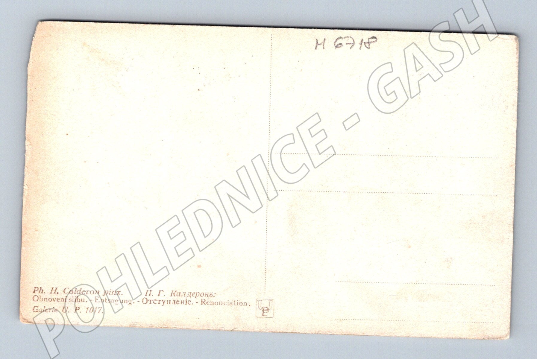 Starobylá umělecká pohlednice s námětem podle obrazu Ph. H. Calderona. Na přední straně je ztvárněna dramatická scéna v interiéru s postavou klečící nahé ženy u oltáře, v přítomnosti několika osob v černých oděvech. Jedná se o pohlednici s názvem Obnovení slibu / Entsagung / Renunciation . Vydáno cca začátek 20. století, galerie U. P. č. 1017. Zadní strana je nepopsaná, pouze s tiskem a informacemi o obrazu v několika jazycích. Pohlednice je černobílá, v dobrém stavu s menšími stopami stáří a opotřebením, rohy lehce otřepené. Vhodné pro sběratele historických a uměleckých pohlednic.