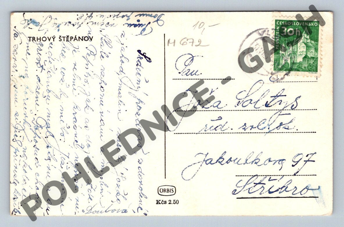 Pohlednice zobrazuje panorama města Trhový Štěpánov v České republice, snímané z větší vzdálenosti a zahrnující rozsáhlou část městské zástavby včetně lesního porostu v popředí. Pohlednice je černobílá, formát malý, typický pro období do poloviny 20. století. Na zadní straně je adresní pole, psaný vzkaz a poštovní razítko s platnou československou známkou v hodnotě 30 haléřů s motivem Pernštejna. Pohlednice je nepoškozená, vhodná pro sběratele historických pohlednic z regionu Česka. Možnost aukce jako sběratelský kousek z první poloviny 20. století.