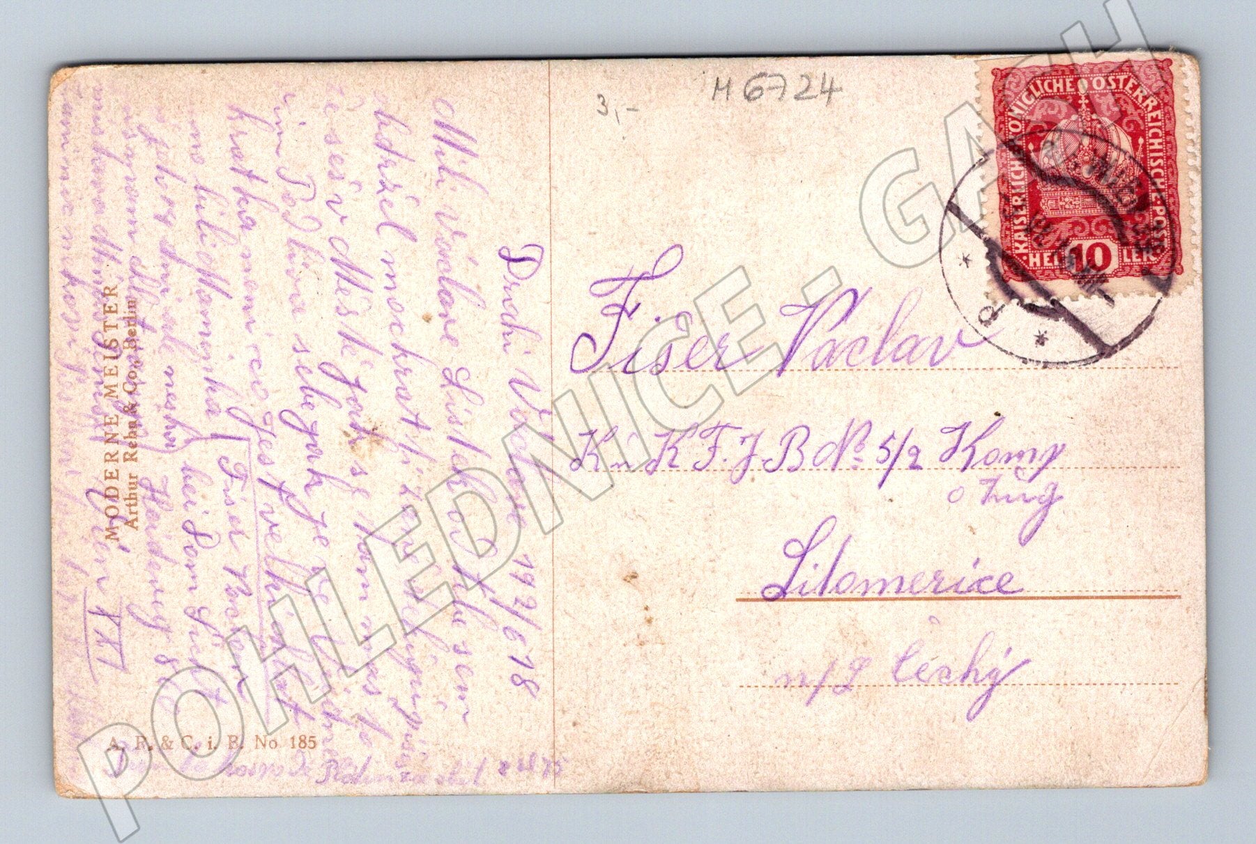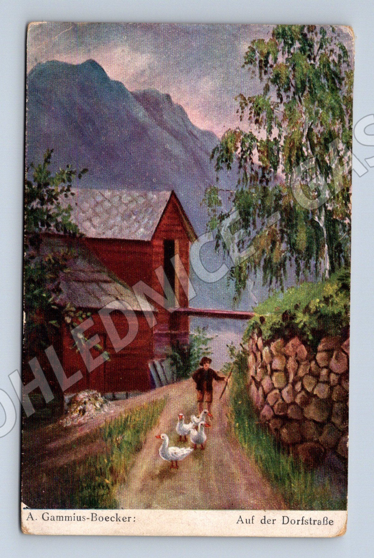 Originální stará pohlednice s uměleckým motivem venkovské cesty – Auf der Dorfstraße od A. Gammius-Boecker. Na malovaném výjevu je vyobrazena žena s holí a hejnem hus na cestě kolem kamenné zídky a venkovského stavení zasazeného do malebné krajiny s horami v pozadí. Pohlednice byla odeslána a obsahuje rukopisný text, adresu i známku Rakousko-Uhersko v nominální hodnotě 10 haléřů. Velice dobrý stav, drobné známky stáří a opotřebení na okrajích. Vhodná pro sběratele historických a tematických pohlednic, milovníky malířství a venkovských motivů.