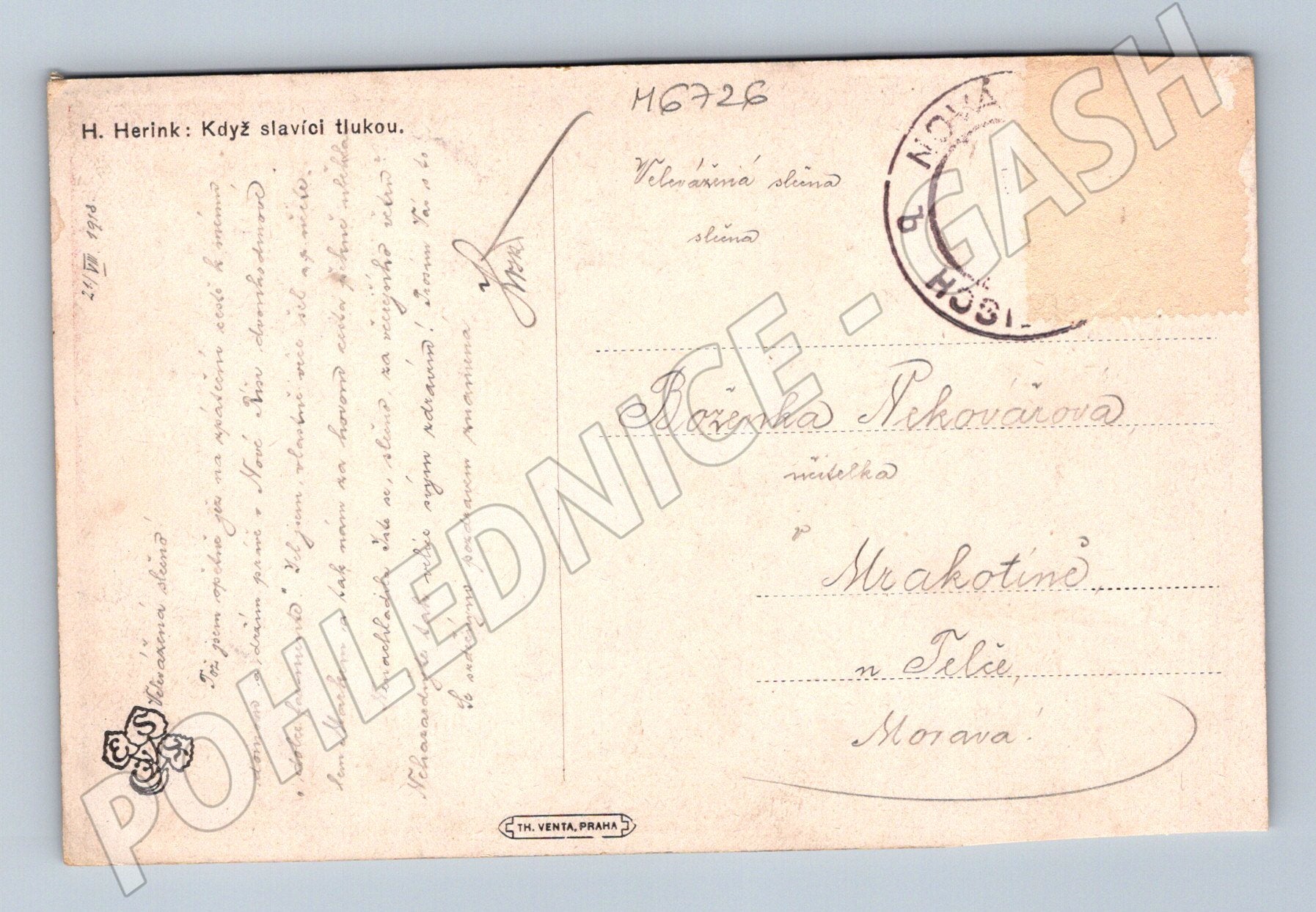 Originální stará pohlednice s názvem Když slavíci tlukou od H. Herinka. Pohlednice zachycuje malebnou scénu dívky u rozkvetlého keře v impresionistickém stylu. Na zadní straně je rukopisný text, známka byla odstraněna, zřejmý otisk poštovního razítka a adresát (Boženka Nekaváčová, Mrákotín u Telče, Morava). Sběratelsky zajímavý kus v solidním stavu, s drobnými známkami stáří na rozích a okrajích. Vydal TH. VENTA, Praha.