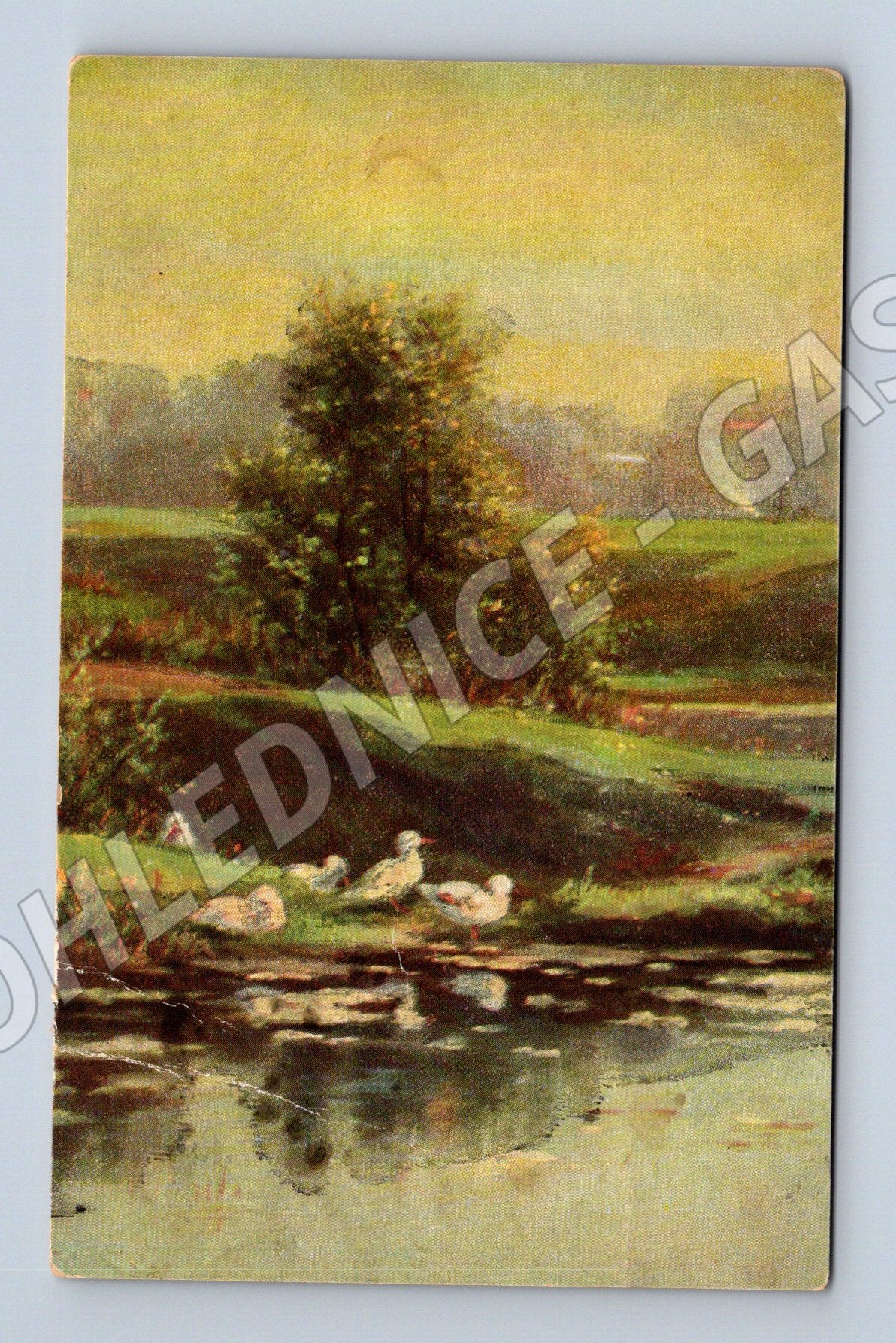 Starobylá pohlednice – česká krajina s kachnami, malý formát, prošlá poštou