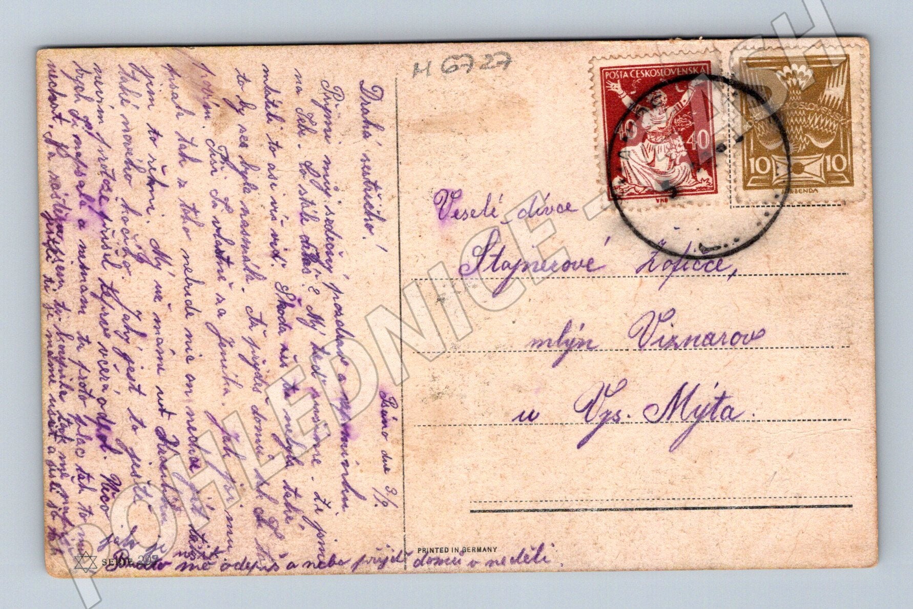 Starobylá pohlednice z období první poloviny 20. století, zaslaná poštou a opatřená známkami Československa (10h a 40h). Na lícové straně je krásná malířská krajina s řekou a bílými kachnami na vodě, v pozadí stromy a odrazy na hladině. Rubová strana obsahuje ručně psaný text fialovým inkoustem a adresu do Knířova u Vysokého Mýta. Pohlednice nese stopy stáří, lehké opotřebení a škrábance, což dokládá její autentičnost. Ideální sběratelský kousek pro milovníky starých českých pohlednic a epistolární historie.