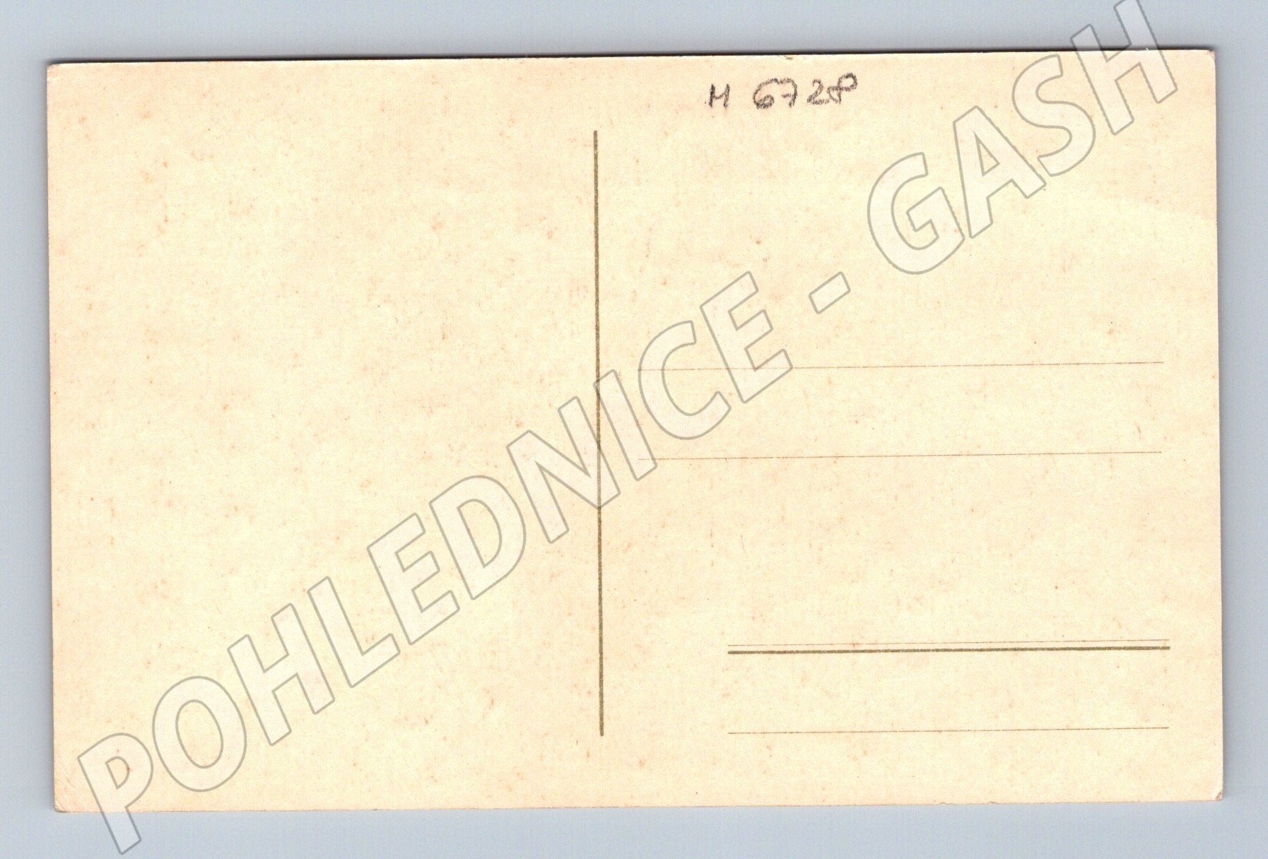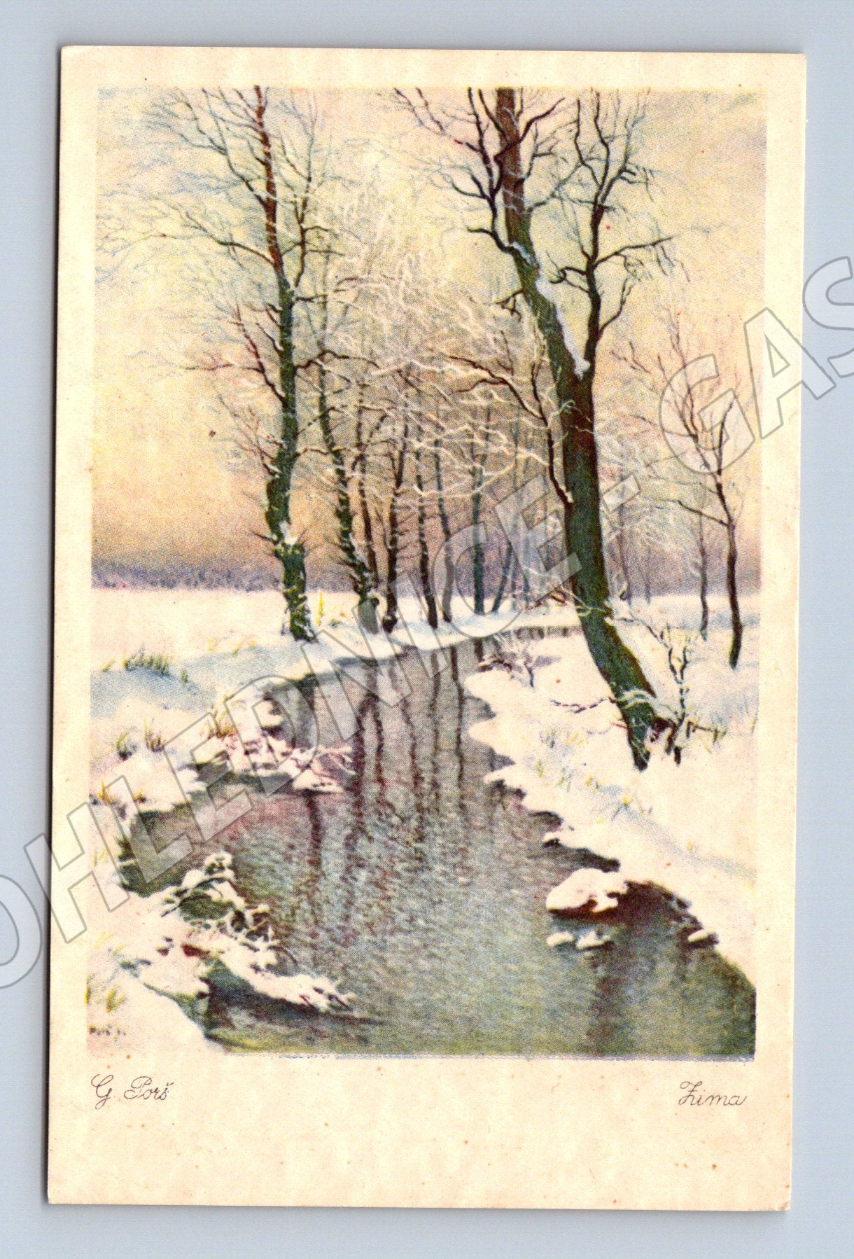 Originální stará pohlednice menšího formátu s motivem zimní krajiny, patrně z Čech nebo Moravy, z období do roku 1950. Přední strana zobrazuje malebný zimní pohled na zamrzlý rybník s břehy lemovanými stromy, jejichž větve jsou pokryté sněhem. Pohlednici dominuje jemné kolorování a signatura autora. Rubová strana je čistá, nepopsaná, se standardním dělením určeným pro adresu a text. Pohlednice je krásným příkladem zimních malovaných námětů své doby a dobře zachovaným sběratelským kouskem.