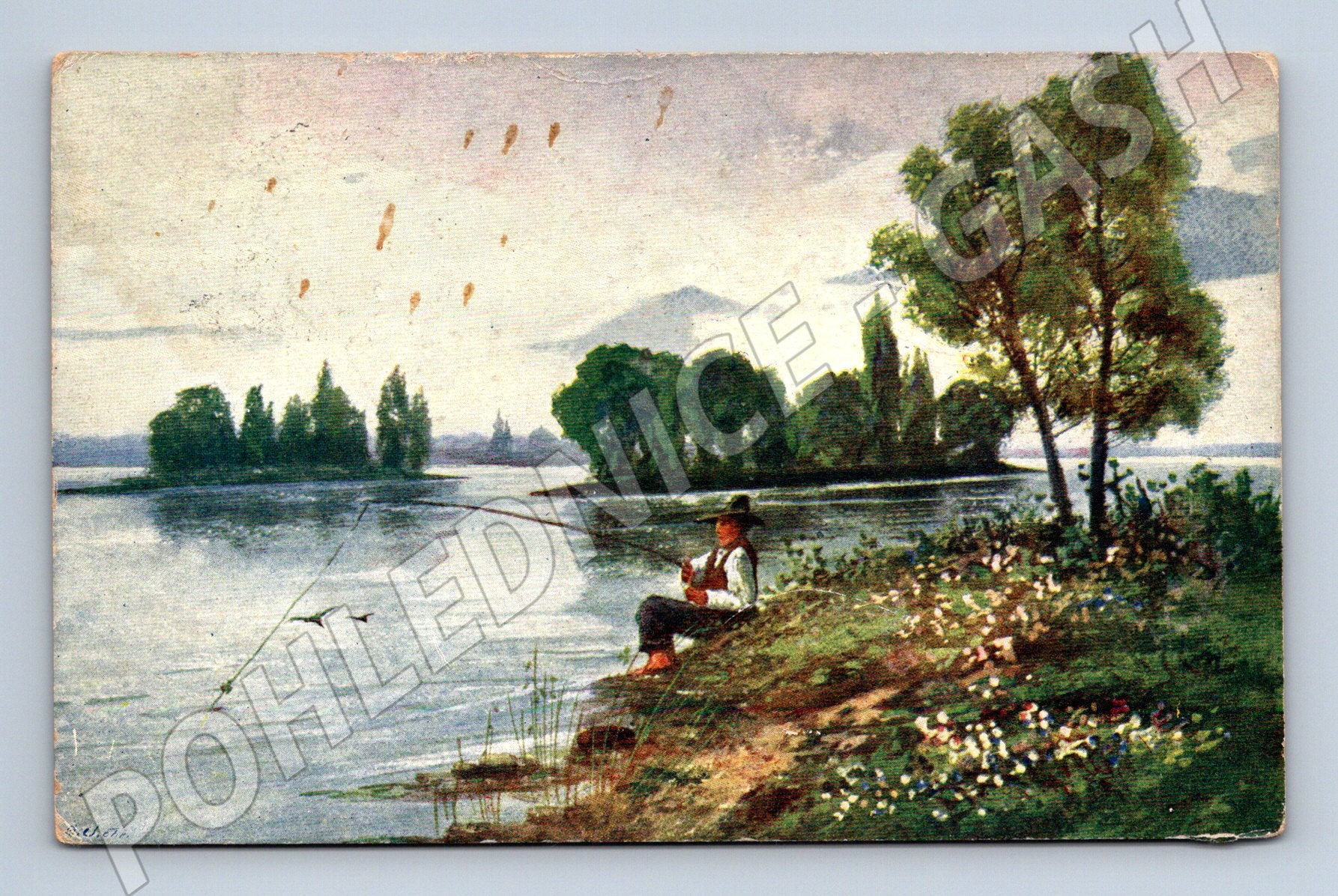 Starý malovaný motiv rybář u řeky, pohlednice Austria, cca 1900