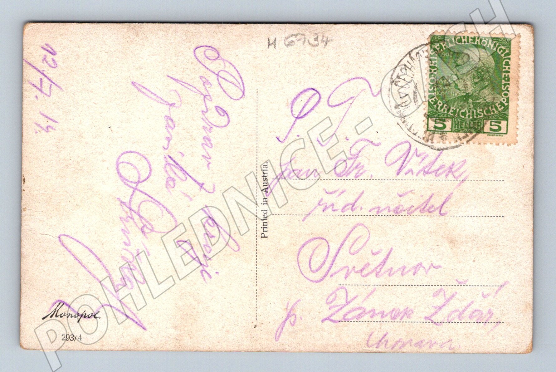 Starobylá pohlednice z období Rakousko-Uherska, vytištěná v Rakousku (Printed in Austria). Na lícové straně malířský motiv s rybářem sedícím na břehu řeky, okolí zdobené květinami a stromy, typická krajina českého venkova. Reverzní strana obsahuje dochované původní poštovní razítko a známku se stářím přes 100 let, pohlednice byla skutečně odeslaná a je opatřena ručně psaným textem. Pohlednice odpovídá malému formátu a je zajímavým dokladem české regionální historie a sběratelským kouskem pro milovníky starých pohlednic a uměleckých ztvárnění přírody. Stav viz foto, částečné stopy stáří a používání.