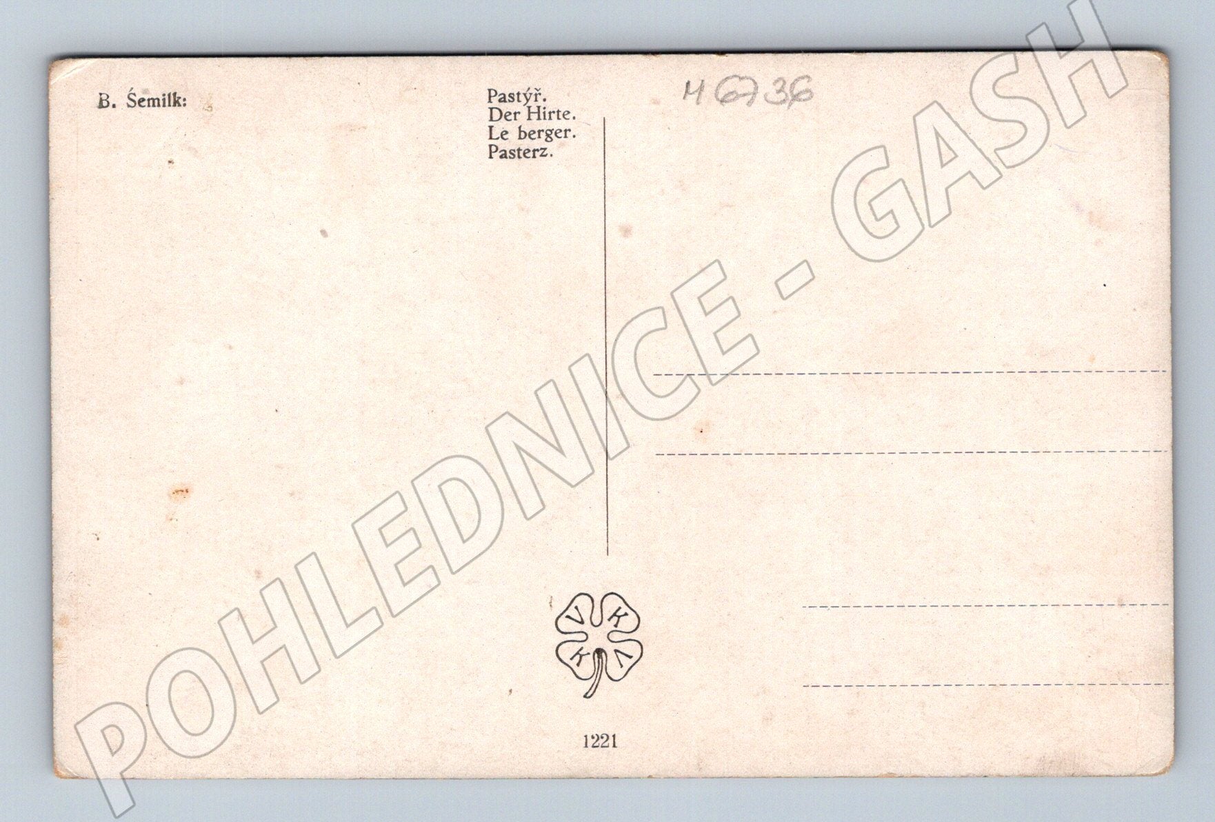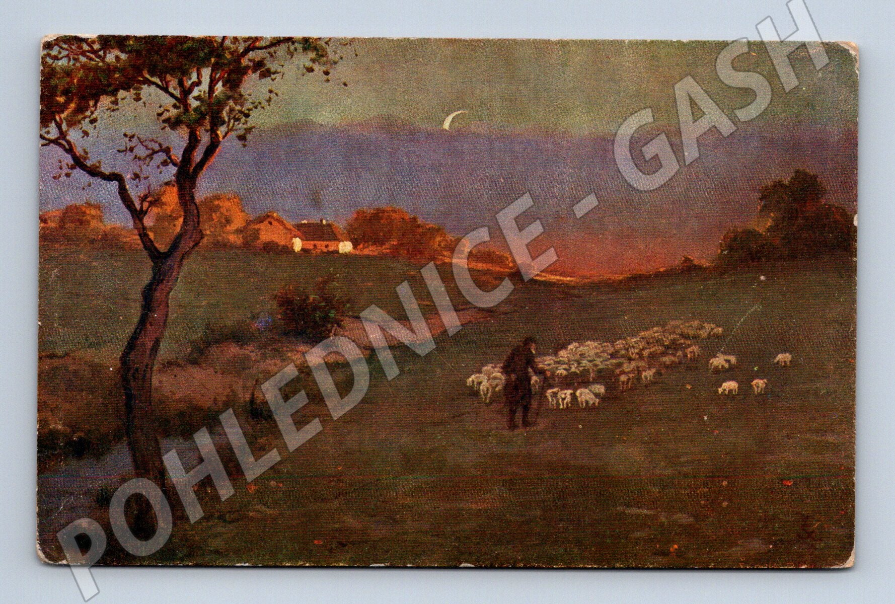 Starší umělecká pohlednice s názvem „Pastýř“, autorem je B. Šemík. Pohlednice zachycuje romantickou krajinomalbu – za soumraku je na louce pastýř se stádem ovcí. V pozadí jsou vidět domečky, na obloze srpek měsíce a celkový motiv je laděn do jemných pastelových barev. Rubová strana je nepopsaná, v horní části je uveden název a autor. Vhodné pro sběratele, milovníky krajinomalby nebo jako dekorace. Pohlednice vykazuje drobné stopy stáří, viz foto.