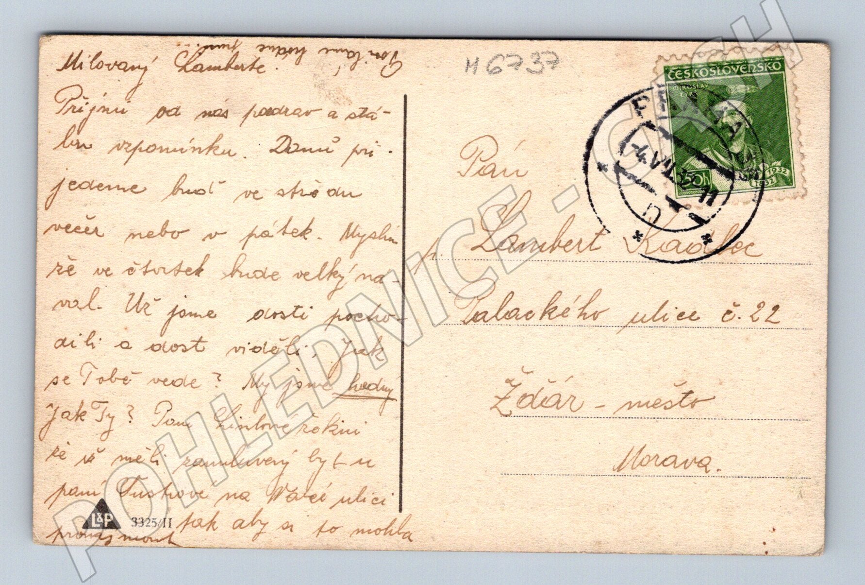 Malovaná pohlednice s venkovskou krajinou zachycuje pastýře s kravami na cestě podél lesa. V pozadí je vidět rybník a silueta hradu či zámku na obzoru. Na zadní straně ručně psaný text, čitelná adresa a poštovní známka ČSR (Československo), razítkovaná v roce 1926 ve Žluticích. Pohlednice nese stopy stáří, ale je v dobrém sběratelském stavu. Krásná ukázka malířské pohlednice z období první republiky, vhodná pro sběratele historických pohlednic a milovníky malířství.