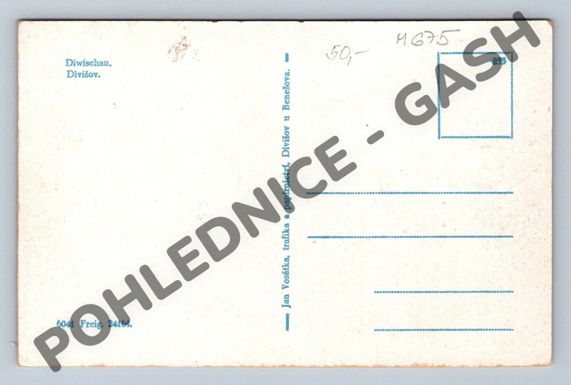 Nabízím starou pohlednici Divišova, zobrazující historické centrum města s dominantní věží kostela a okolními domy. Pohlednice je černobílá, s typickým vzhledem malé formy a pochází z období do roku 1950. Na zadní straně je místo pro adresu a poštovní známku, text v němčině a češtině, zejména označení místa Diwischau, Divišov a informace o vydavateli Jana Vosičky. Pohlednice je vhodná pro sběratele starých pohlednic z České republiky a milovníky historie regionu. Stav odpovídá stáří, bez výrazných poškození.
