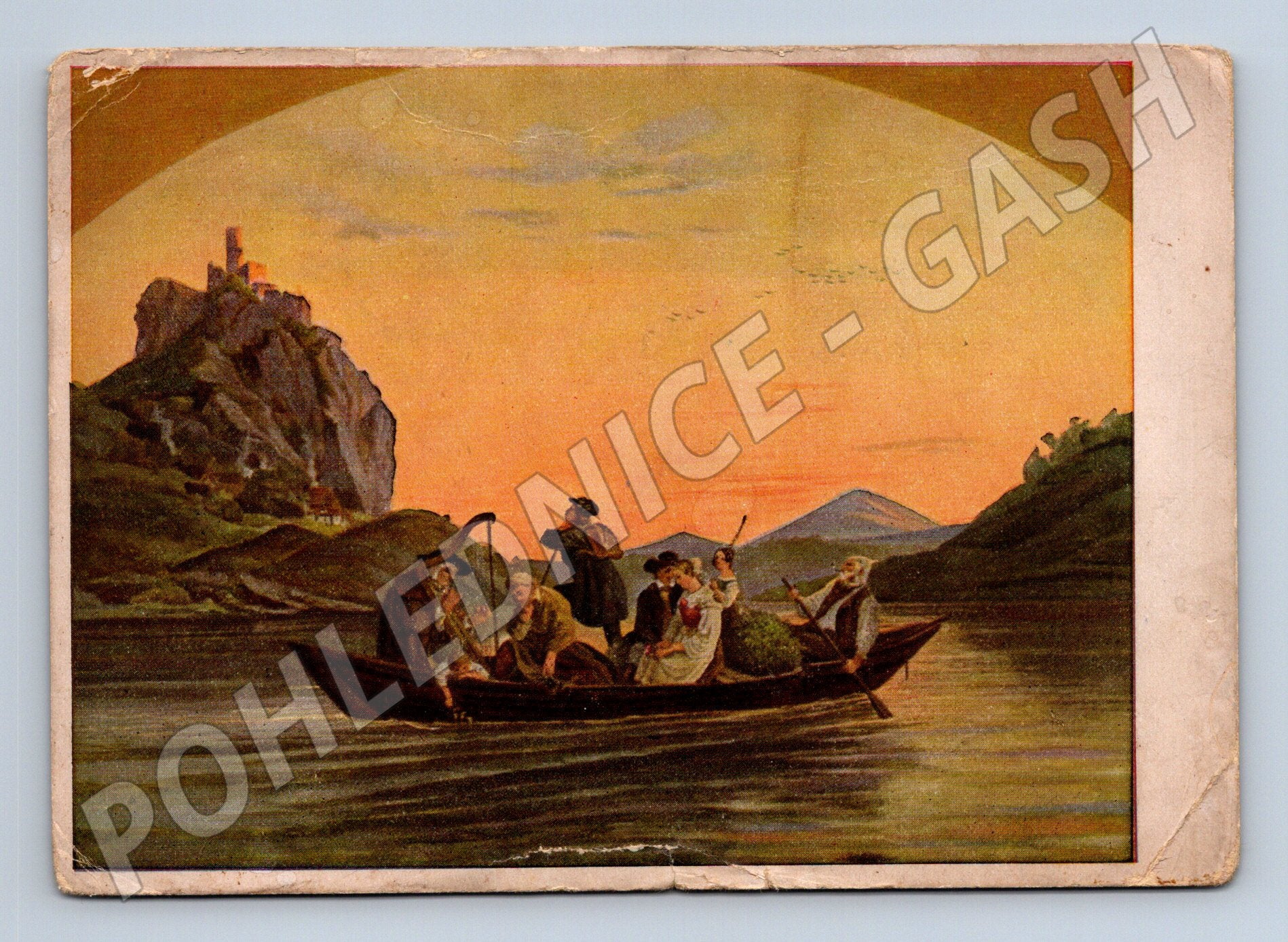 Originální stará pohlednice s motivem malby Überfahrt am Schreckenstein (Převoz u Schreckensteinu) od významného německého malíře Ludwiga Richtera (1803–1884). Pohlednice zachycuje romantickou scénu převozu skupiny osob na veslici po řece, v pozadí s dominantou hradu na skalnatém vrchu a zapadajícím sluncem, které dotváří kouzelnou atmosféru. Na zadní straně je tiskem označen autor, název i vydavatel: Dresdner Fein Papier Erhard Buhlowsky, Dresden. Pohlednice má známky stáří a patiny, je určena pro sběratele, milovníky historických pohlednic a milovníky řeky Labe a jejího okolí.
