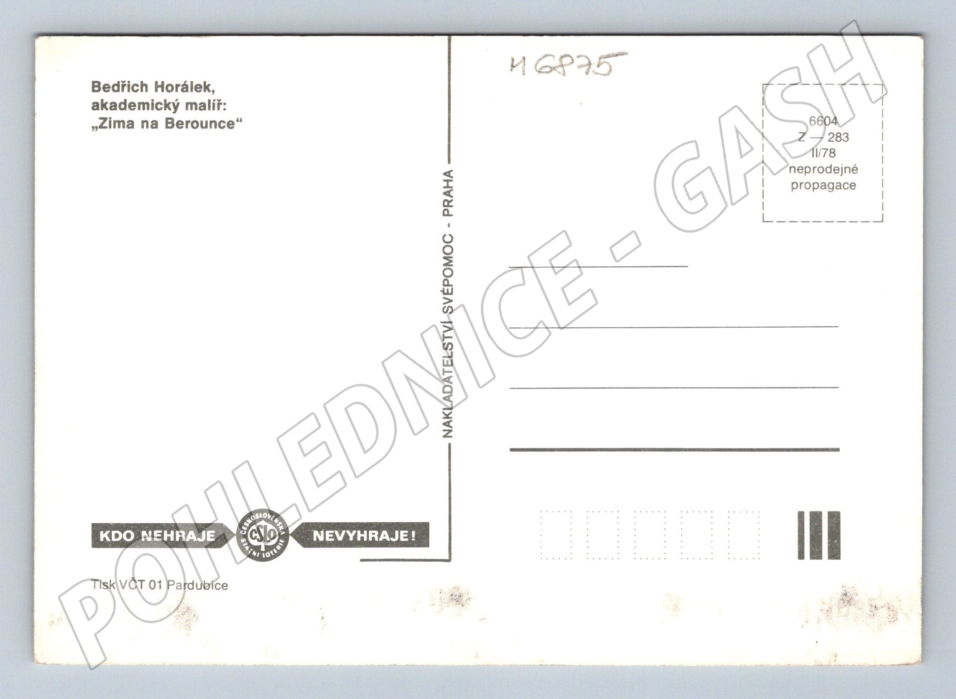 Umělecká pohlednice s názvem Zima na Berounce od akademického malíře Bedřicha Horálka. Pohlednice zachycuje zimní krajinu s řekou Berounkou, pokrytou sněhem a ledem, s jemnými detaily přírodní scenérie a tlumenými zimními barvami. Vydal tisk VČT 01 Pardubice, Praha. Rok vydání: II/78, neprodejné – pouze propagační účel. Rub je nepopsaný, sběratelský stav viz foto. Skvělý doplněk pro milovníky umění nebo sběratelské pohlednice českých malířů.