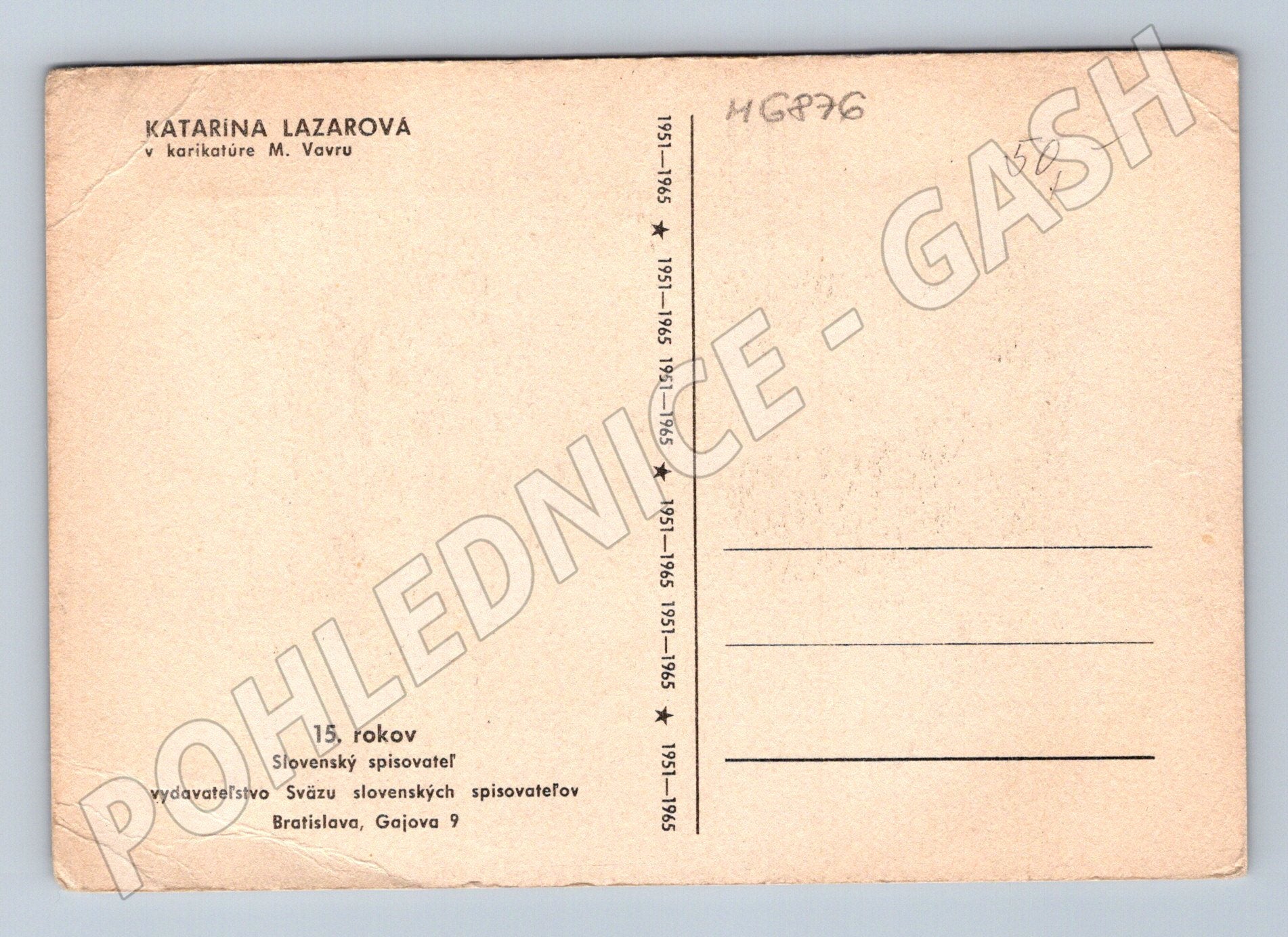 Originální pohlednice s karikaturou Kataríny Lazarové od M. Vavru, vydaná k 15. výročí Svazu slovenských spisovatelů v Bratislavě. Na přední straně je stylizovaná kresba a podpis karikaturisty. Zadní strana je neprošlá a obsahuje informace o vydavatelství. Mírné opotřebení rohů a okrajů, jinak pěkný stav. Výjimečný sběratelský kousek z období 1951-1966, vhodný pro milovníky literatury i karikatur.