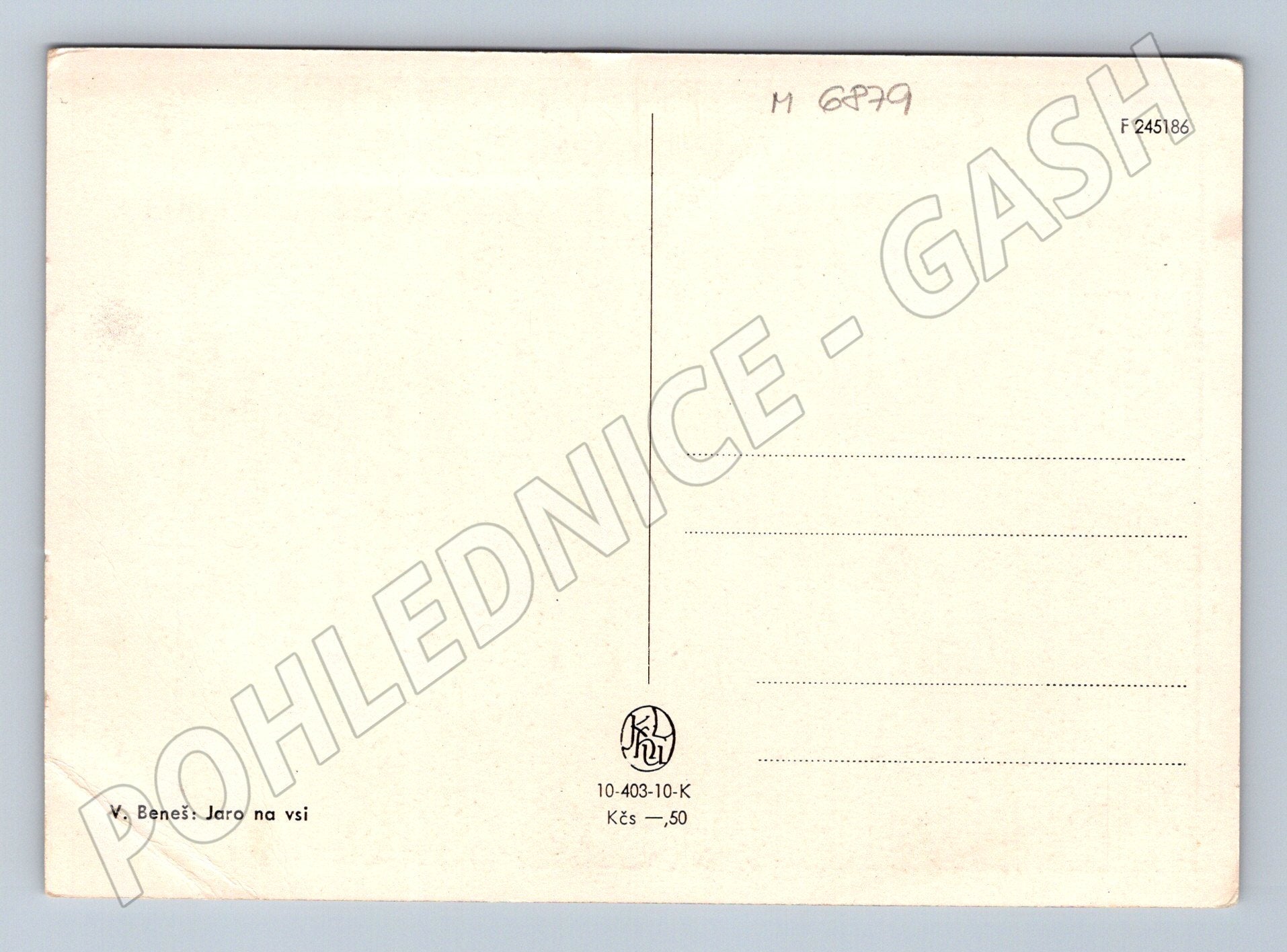 Umělecká pohlednice s reprodukcí díla Jaro na vsi od V. Beneše. Pohlednice zachycuje jarní venkovskou scenérii s domy, stromy a plotem v jemně impresionistickém stylu. Na zadní straně je uveden autor a název díla, pohlednice je neprošlá, bez známky, s vyznačením místa pro adresu a zprávu. Mírné známky stáří, drobný ohyb v rohu. Vhodné pro sběratele uměleckých pohlednic i milovníky českého malířství.