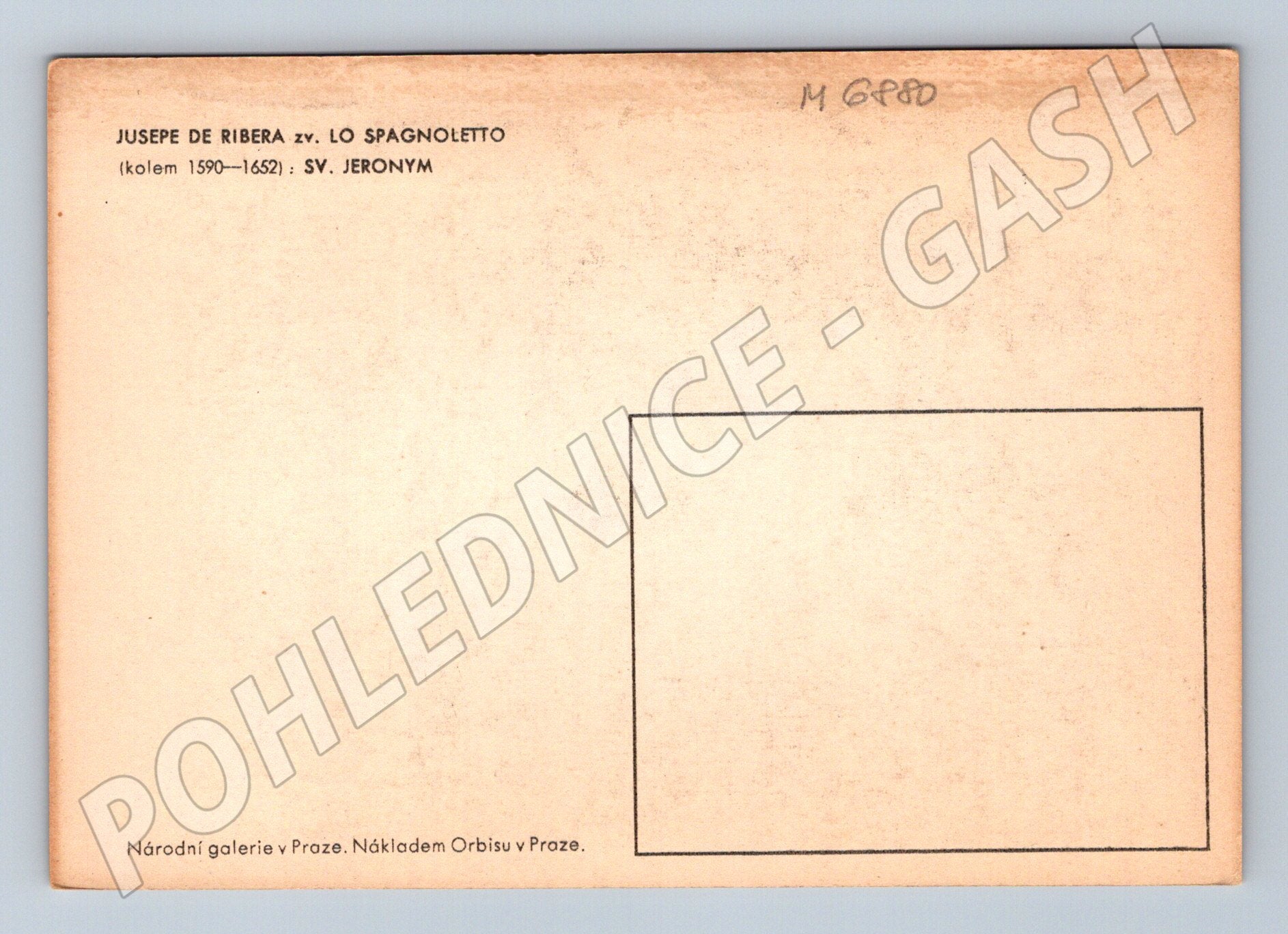 Nabízím originální starou pohlednici s reprodukcí slavného obrazu Svatý Jeroným od malíře Jusepe de Ribera, zvaného Lo Spagnoletto (kolem 1590–1652). Pohlednice byla vydána v Praze Národní galerií, vydavatel Orbis. Na přední straně je vyobrazen asketický svatý Jeroným s typickými atributy – knihami, lebkou a lvem, což odkazuje na jeho poustevnický život. Zadní strana je nepsaná a obsahuje popis a základní informace o autorovi a díle. Výborný sběratelský stav, mírné zažloutnutí odpovídající stáří pohlednice. Výjimečná nabídka pro milovníky umění, sběratele pohlednic nebo zájemce o staré evropské mistry.