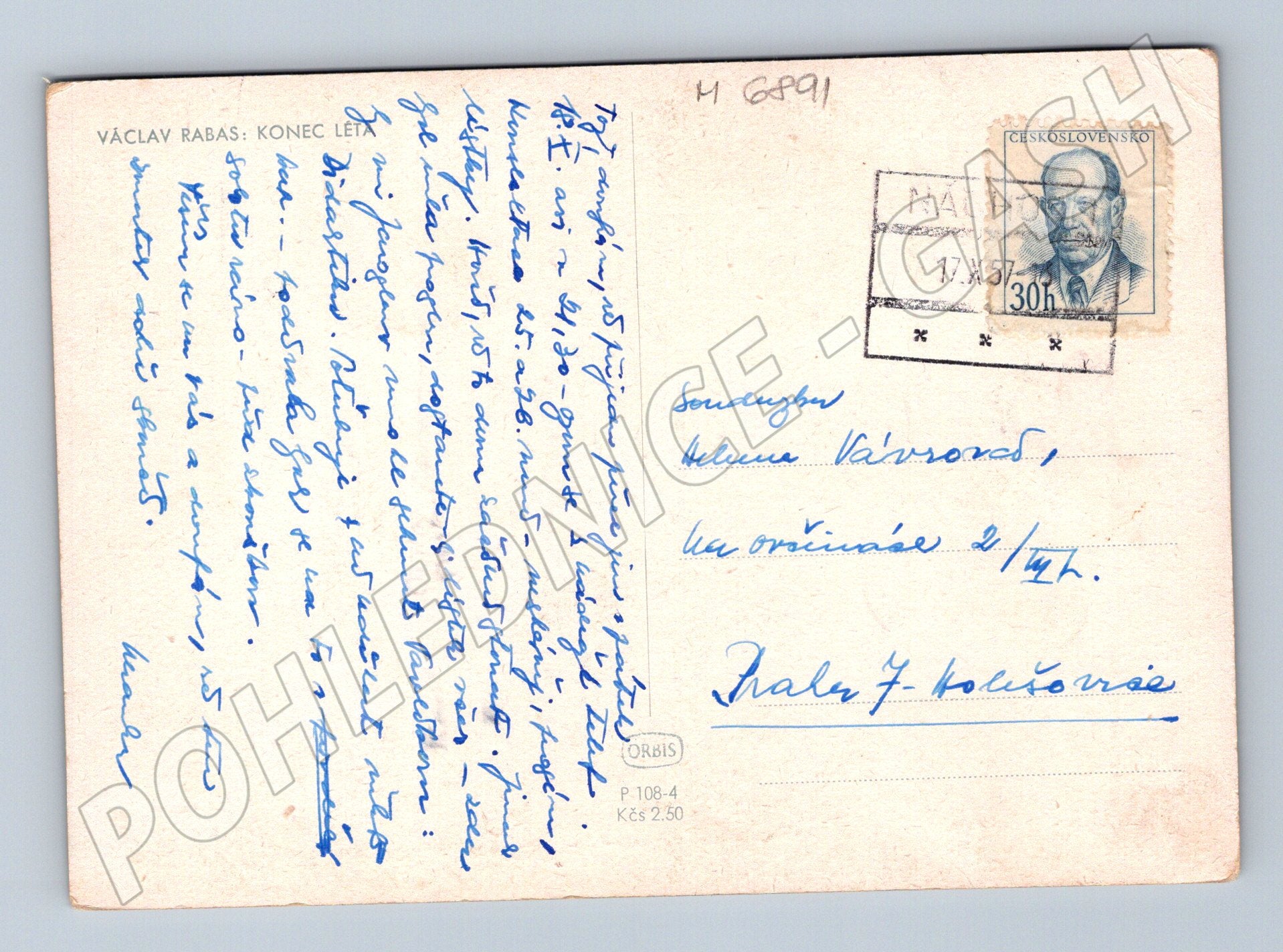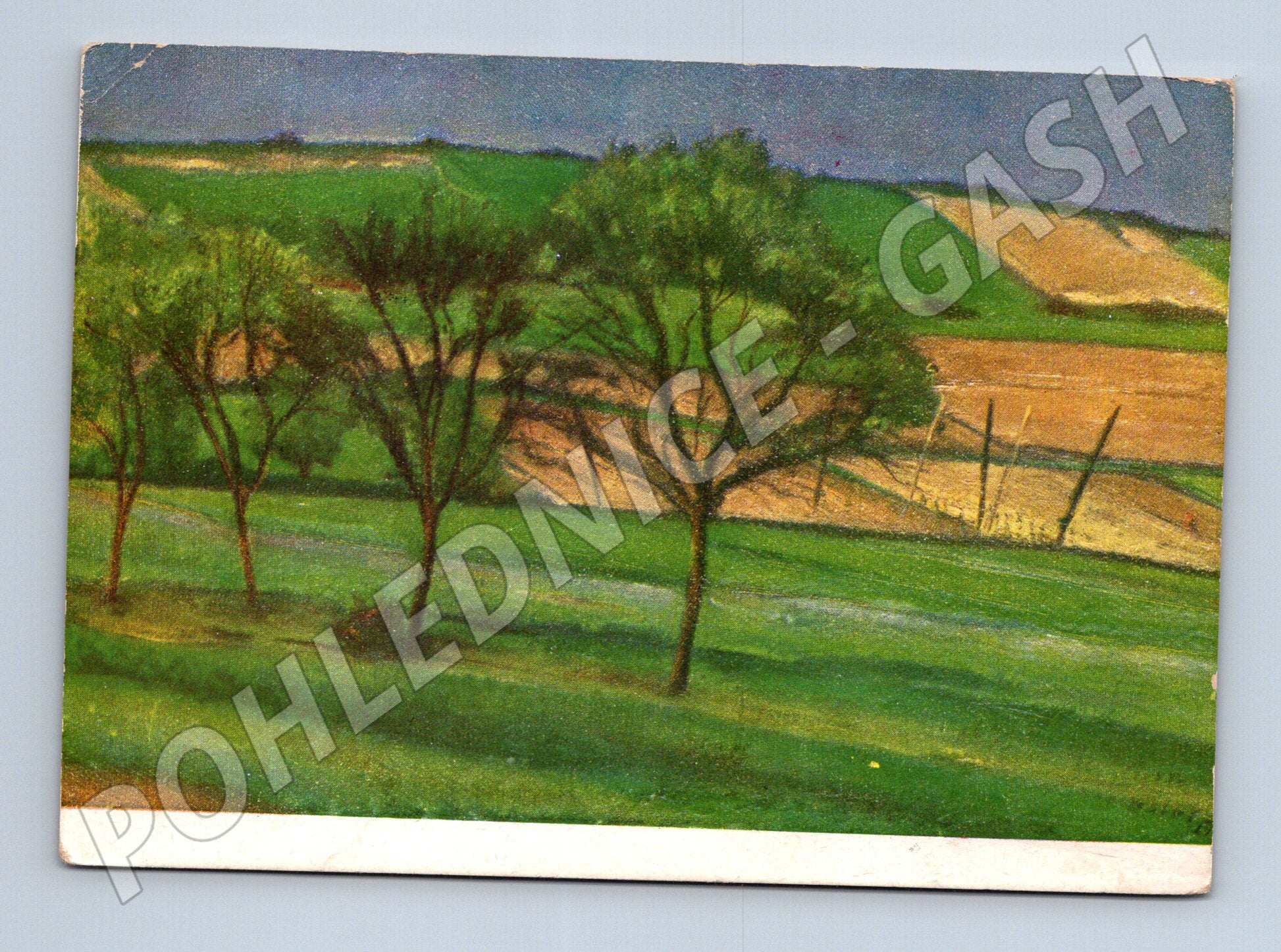 Nabízím originální pohlednici s reprodukcí obrazu Konec léta od významného českého malíře Václava Rabase. Pohlednice pochází z období Československa, je prošlá poštou a má na zadní straně razítko a známku s portrétem. Rukou psaný text adresovaný Heleně Kairosové dodává pohlednici osobitý historický nádech. Pohlednice je v dobrém sběratelském stavu, pouze drobné opotřebení rohů odpovídající stáří. Vhodné pro sběratele uměleckých pohlednic či milovníky české krajiny a umění.
