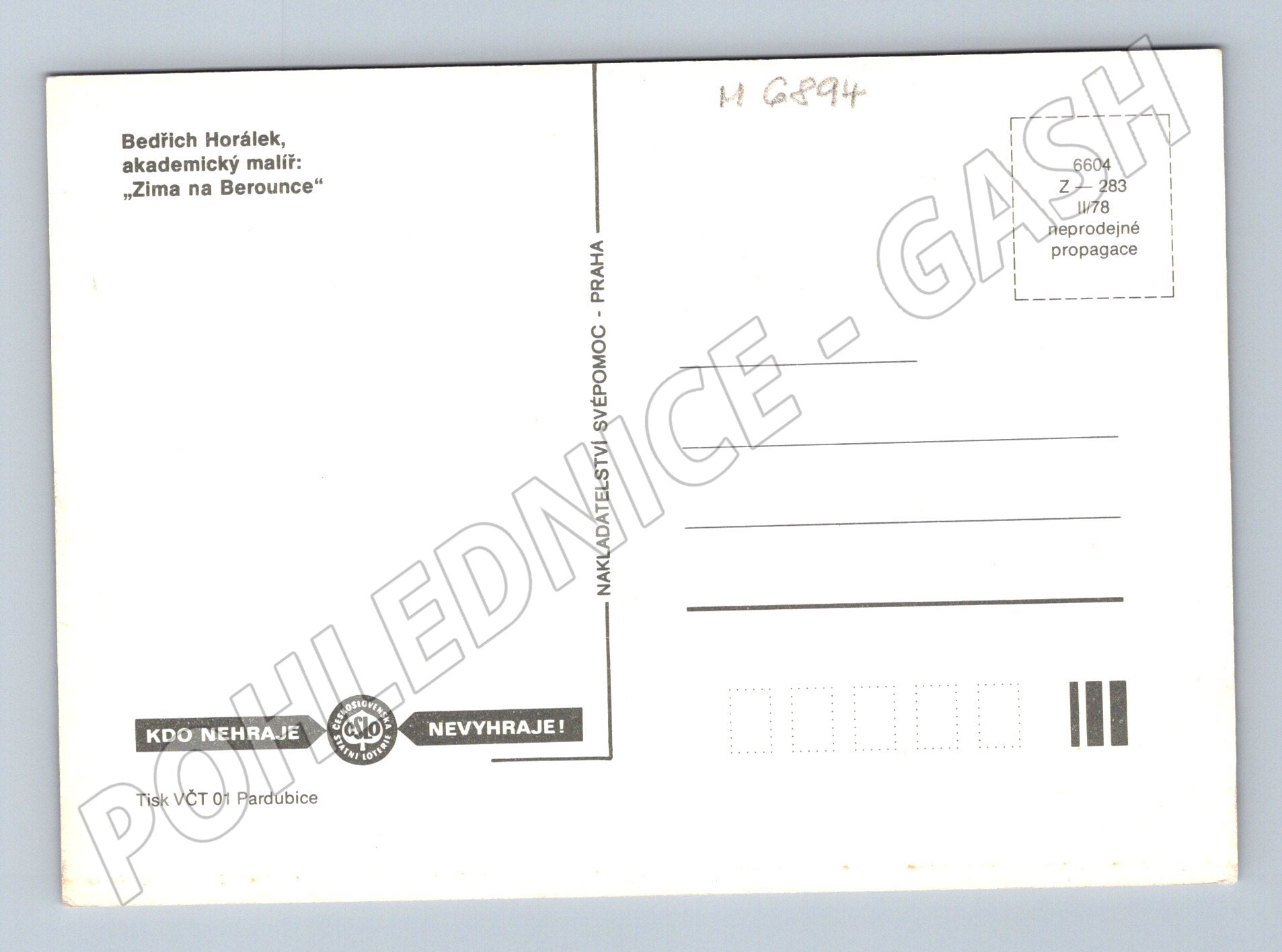 Barevná pohlednice s motivem zimní krajiny na Berounce od akademického malíře Bedřicha Horálka. Na přední straně je reprodukce malby s názvem Zima na Berounce , typický pohled na zamrzlou řeku a okolní přírodu. Pohlednice nebyla použita, je ve velmi dobrém stavu. Vydal: Nakladatelství Svépomoc Praha, Tisk VČT Pardubice, rok vydání II/78 (1978). Na zadní straně propagační text SČL - Kdo nehraje, nevyhraje! . Sběratelsky zajímavý kousek pro milovníky českého malířství a regionální tematiky.