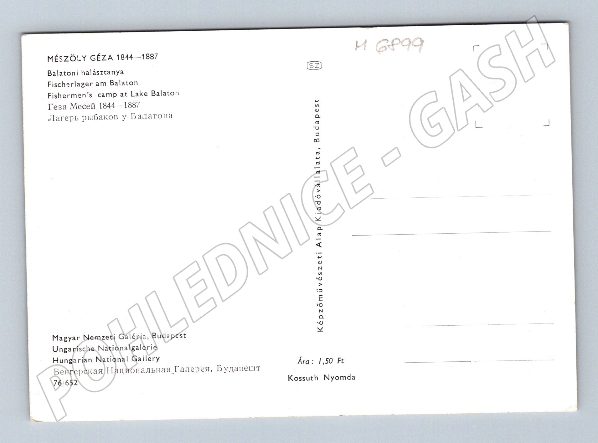 Pohlednice ze sbírky Maďarské národní galerie v Budapešti, s reprodukcí obrazu Gézy Mészölyho (1844–1887) „Fischermen s camp at Lake Balaton“ – Rybářský tábor u Balatonu. Na přední straně je malebné ztvárnění krajiny s rybáři na břehu jezera Balaton, vytisknuto na kvalitním papíře. Zadní strana je nepoškozená, čistá, s textem v několika jazycích včetně češtiny, maďarštiny, němčiny, angličtiny a ruštiny. Vydáno v Maďarsku, cena 1,50 Ft. Výborný stav, vhodné pro sběratele i milovníky umění.