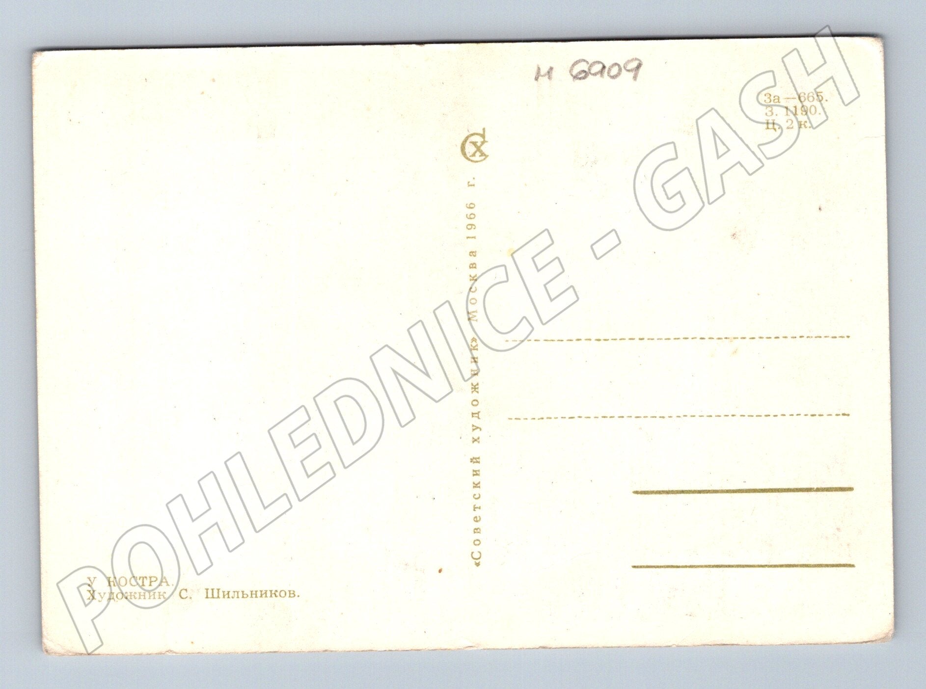 Unikátní sovětská pohlednice z roku 1966 s názvem U ohně od umělce S. Shilnikova. Pohlednice zobrazuje tradiční výjev s postavou sedící u táborového ohně, v pozadí zasněžená krajina a typický oděv. Vhodné pro sběratele tematických, etnografických nebo ruských pohlednic. Stav pohlednice viz foto. Výrobce: Sovětský umělec, Moskva. Vytištěno 1966. Text v ruštině.