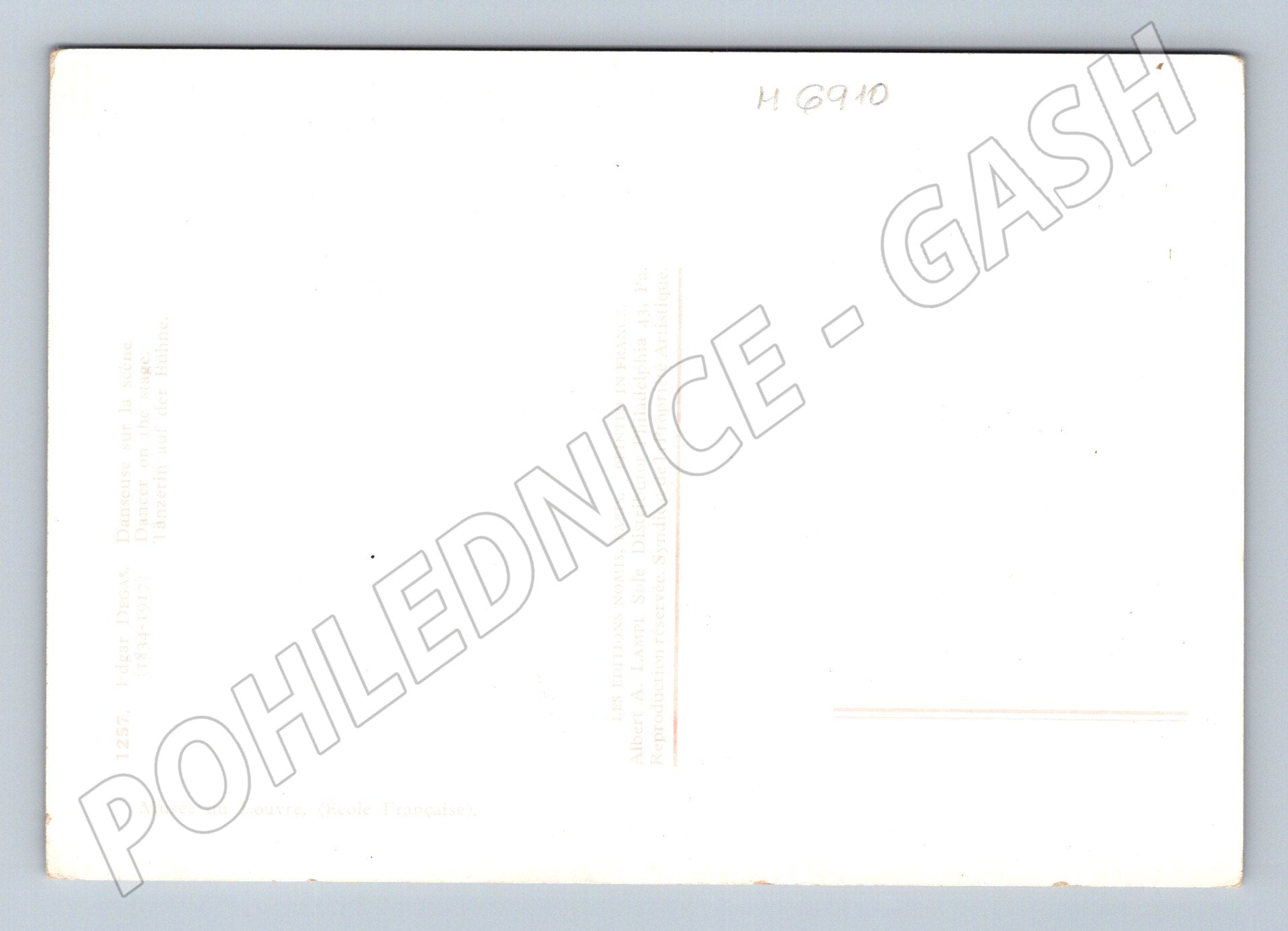 Umělecká pohlednice zobrazující slavný obraz baletky na scéně od Edgara Degase. Reprodukce pochází z cyklu vystaveného v Musée du Louvre, pravděpodobně z přelomu 19. a 20. století (École Française). Zadní strana pohlednice je nevyplněná, s popisem v několika jazycích. Výborný stav, bez známek poškození. Krásný doplněk pro sběratele pohlednic či milovníky výtvarného umění. Vhodné také jako dekorace nebo originální dárek.