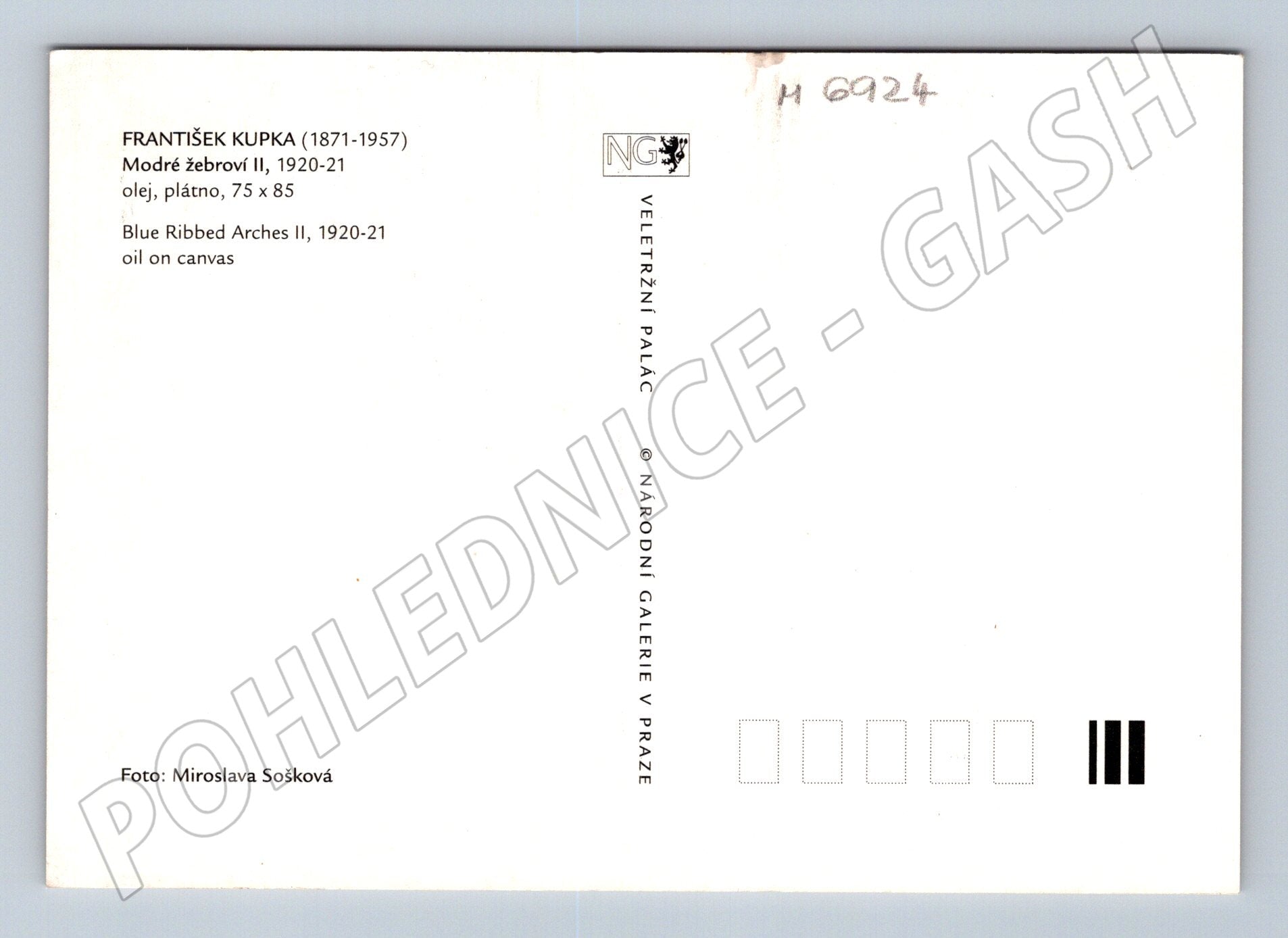 Pohlednice s reprodukcí díla významného českého malíře Františka Kupky (1871-1957), jednoho ze zakladatelů moderní abstraktní malby. Na pohlednici je vyobrazen obraz Modré žebroví II z let 1920-21 (olej, plátno, rozměry 75 x 85 cm), který je součástí sbírek Národní galerie v Praze, konkrétně ve Veletržním paláci. Jedná se o zajímavou ukázku Kupkova originálního výtvarného stylu. Fotografii pohlednice pořídila Miroslava Sošková. Na zadní straně pohlednice jsou uvedeny základní informace o díle a autorovi. Vhodné pro sběratele a milovníky moderního umění.