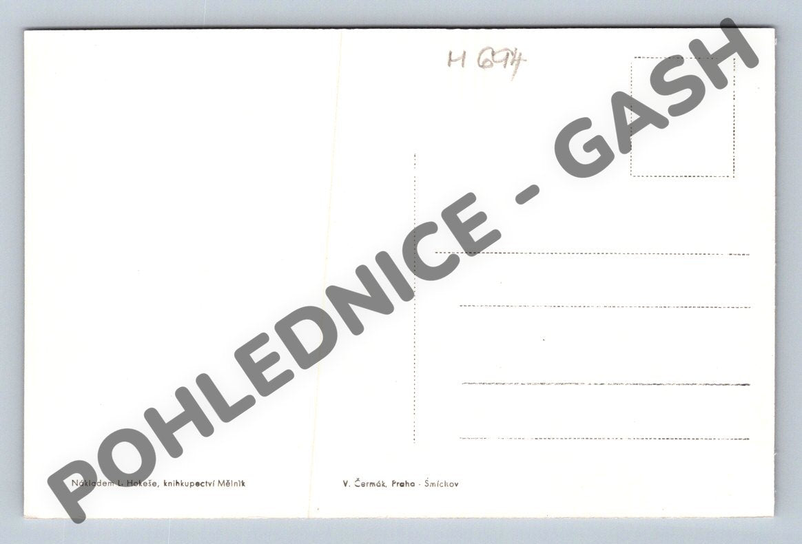 Starší černobílá pohlednice zobrazující Mělník nad Labem s lodí plující po řece. Na pozadí dominují historické stavby a kostel na vyvýšeném břehu. Pohlednice je v dobrém stavu a představuje zajímavý pohled na vodní dopravu a architekturu města Mělník během minulých dekád. Na rubu je místo pro adresu a známku, pohlednice není použita a je vhodná pro sběratele nebo jako dekorativní předmět.