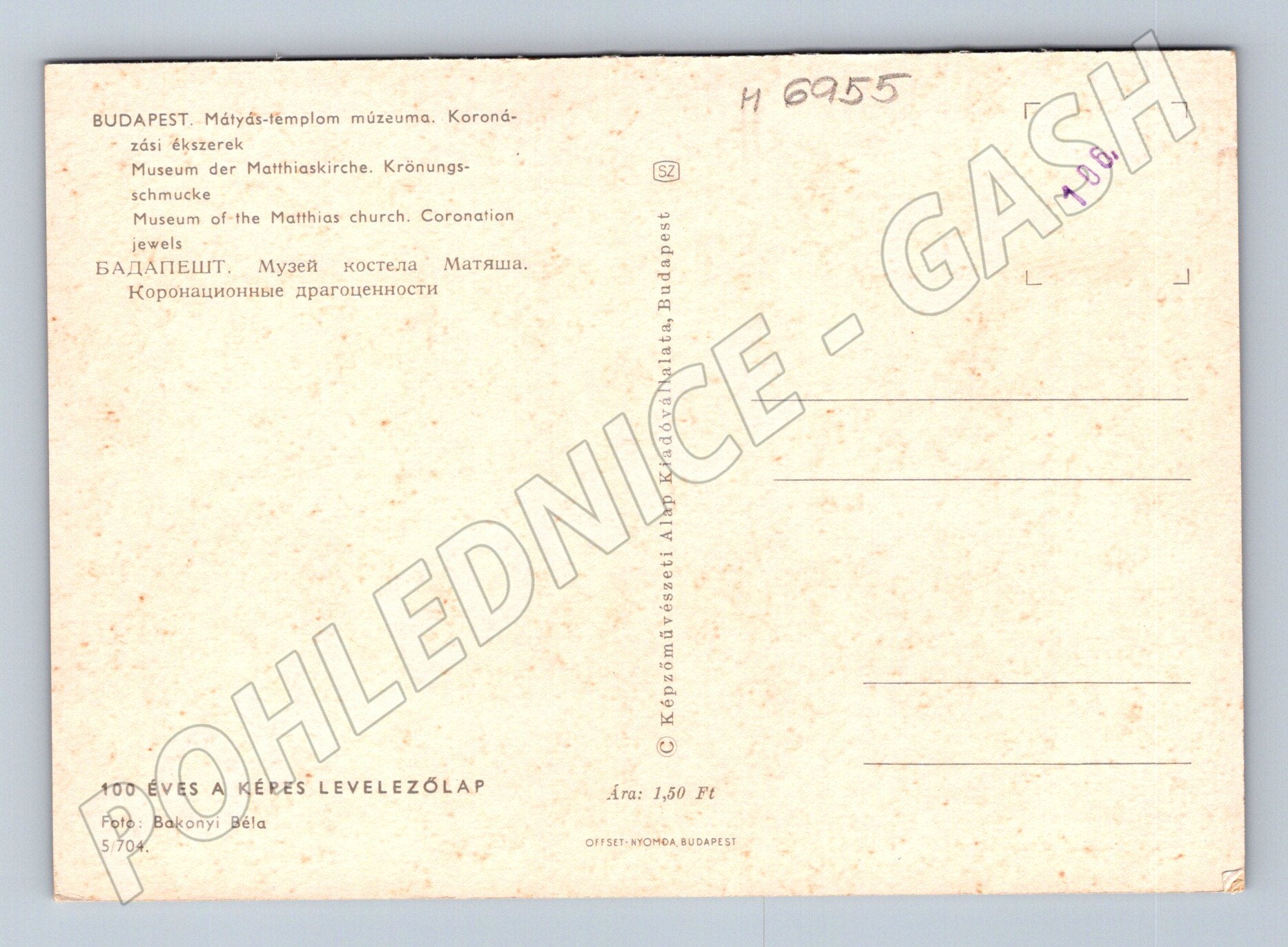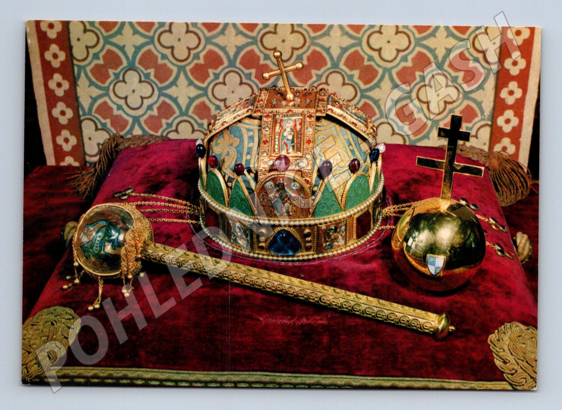 Originální pohlednice zobrazující korunovační klenoty Uherského království vystavené v Muzeu kostela Mátyáse v Budapešti. Na pohlednici jsou vyobrazeny svatoštěpánská koruna, žezlo a jablko. Text na zadní straně je v několika jazycích (maďarština, němčina, angličtina, ruština). Fotografie: Bakonyi Béla. Stav velmi zachovalý, neprošlá poštou, sběratelský kousek.