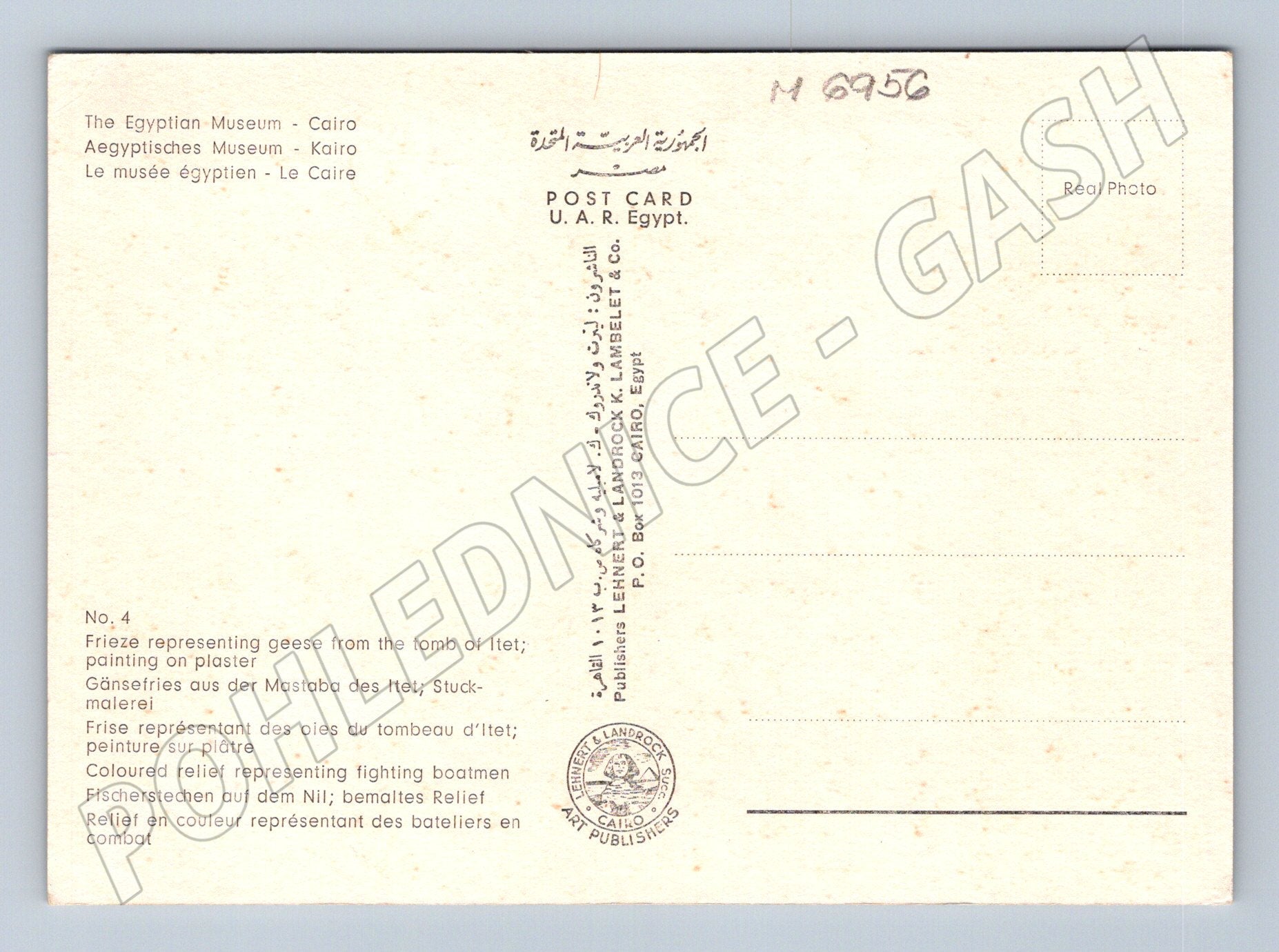 Originální pohlednice z Egyptského muzea v Káhiře, zobrazující dvě slavné malby ze staroegyptského období. Horní část pohlednice zachycuje reliéf s motivem zápasu lodníků na Nilu - barevné bojové scény z období Staré říše. Spodní část patří slavnému frízu se šesti husami z mastaby Itet v Médúmu, jedné z ikon staroegyptského umění. Popsáno v několika jazycích včetně angličtiny, němčiny a francouzštiny. Na zadní straně základní popis a informace o vydavateli (Heliopolis, Egypt). Výborný stav, skvělý sběratelský kus pro milovníky historie a egyptologie.