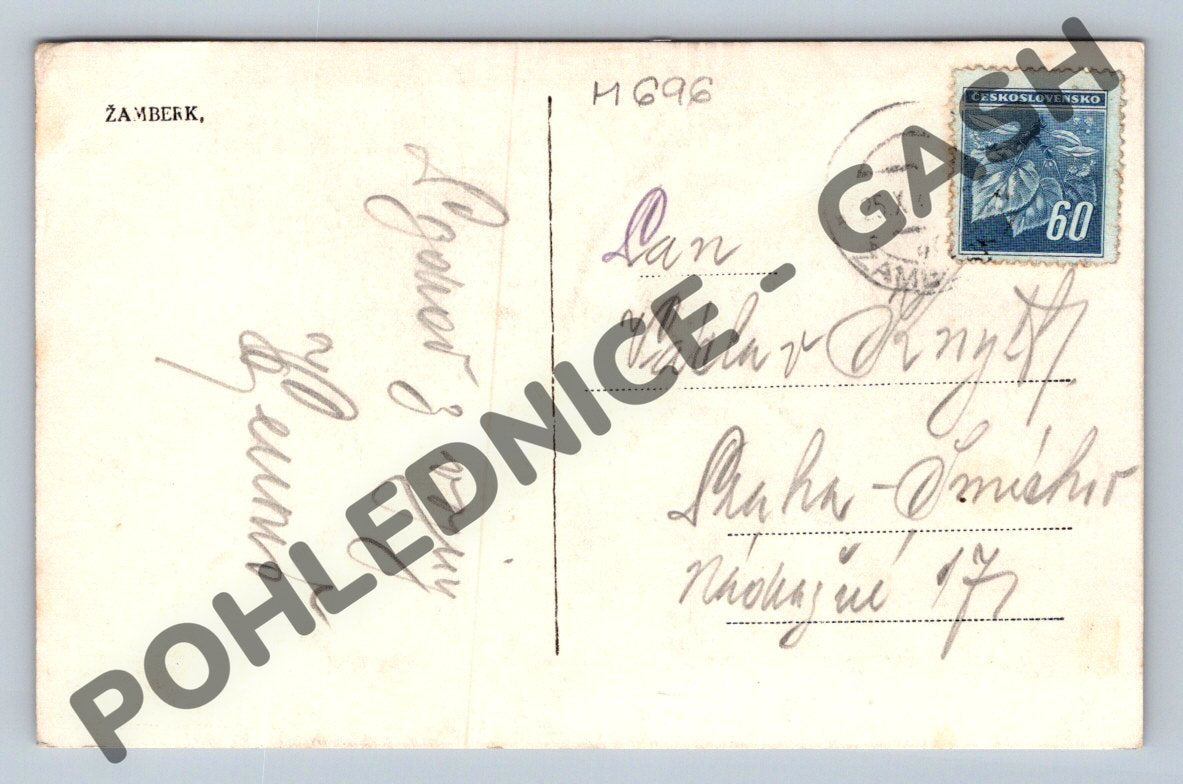 Starší černobílá pohlednice zobrazující město Žamberk s výraznou historickou architekturou v popředí, dominují dvě vysoké věže kostela. Pohlednice je opatřena poštovní známkou Československa s hodnotou 60 haléřů a ručně napsaným adresátem. Pohlednice je v dobrém stavu s viditelnými známkami stáří, vhodná pro sběratele historických pohlednic ze střední Evropy.