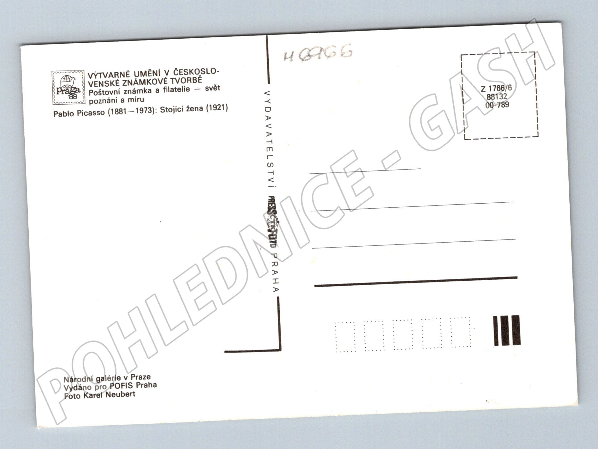 Pohlednice s reprodukcí obrazu Pablo Picasso – Stojící žena (1921). Vydáno pro POPIS Praha, fotografie Karel Neubert, Národní galerie v Praze. Na zadní straně informace o autorovi a díle, určeno pro sběratele, možnost poštovního použití. Zachovalý stav, nevlepená, čistá bez popisu. Vhodná pro milovníky umění a sběratele pohlednic.