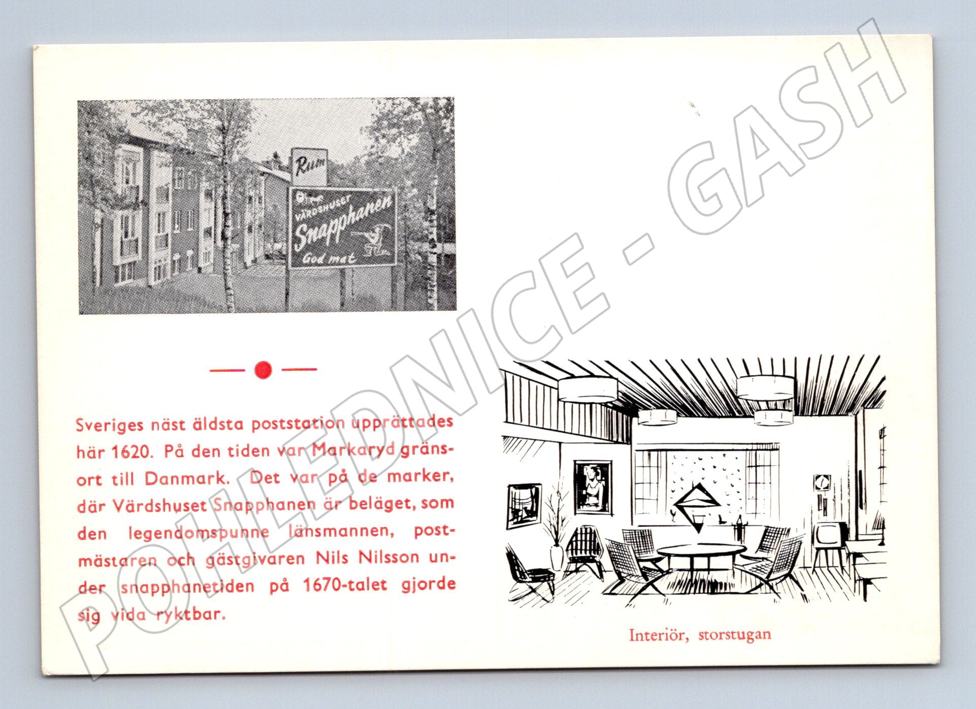 Originální pohlednice z Markaryd ve Švédsku, konkrétně z historického hostince Värdshuset Snapphanen (Europahotel E4). Pohlednice zachycuje exteriér hostince a interiér společenské místnosti. Obsahuje také zajímavý popis historie – jedná se o místo, kde byla v roce 1620 zřízena druhá nejstarší poštovní stanice ve Švédsku, v době kdy Markaryd byl pohraniční oblastí sousedící s Dánskem. Hostinec Snapphanen je známý již od 16. století a významně se proslavil díky postavě Nils Nilssona během období snapphanů v 17. století. Text i ilustrace krásně doplňují švédskou historickou atmosféru. Pohlednice je nepopsaná a ve velmi dobrém stavu, vhodná pro sběratele nebo milovníky Skandinávie.