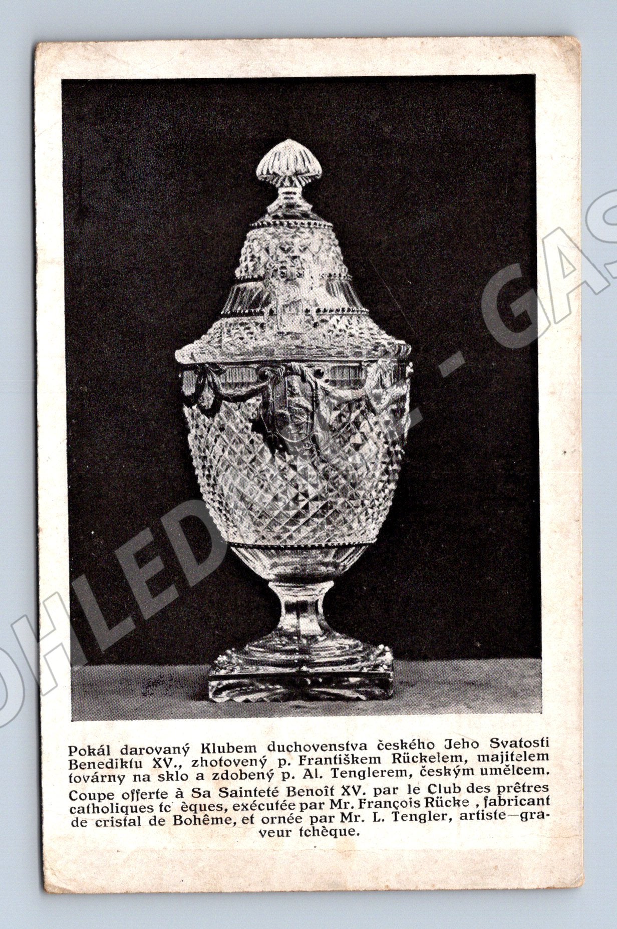 Originální stará pohlednice menšího formátu z období do roku 1950. Na přední straně je černobílá fotografie skleněného poháru, který byl darován Klubem duchovenstva českého Jeho Svatosti Benediktu XV. Nádobu navrhl a zhotovil český mistr uměleckého skla p. F. A. Tengrler v Amsterodamu. Pohlednice je opatřena popisem v češtině i francouzštině. Zadní strana je nepopsaná, označená jako dopisnice. Místy jsou patrné známky stáří a lehkého opotřebení na rozích, jinak velmi dobrý stav a poutavý sběratelský kus, vhodný pro milovníky historie, pohlednic i českého sklářství.