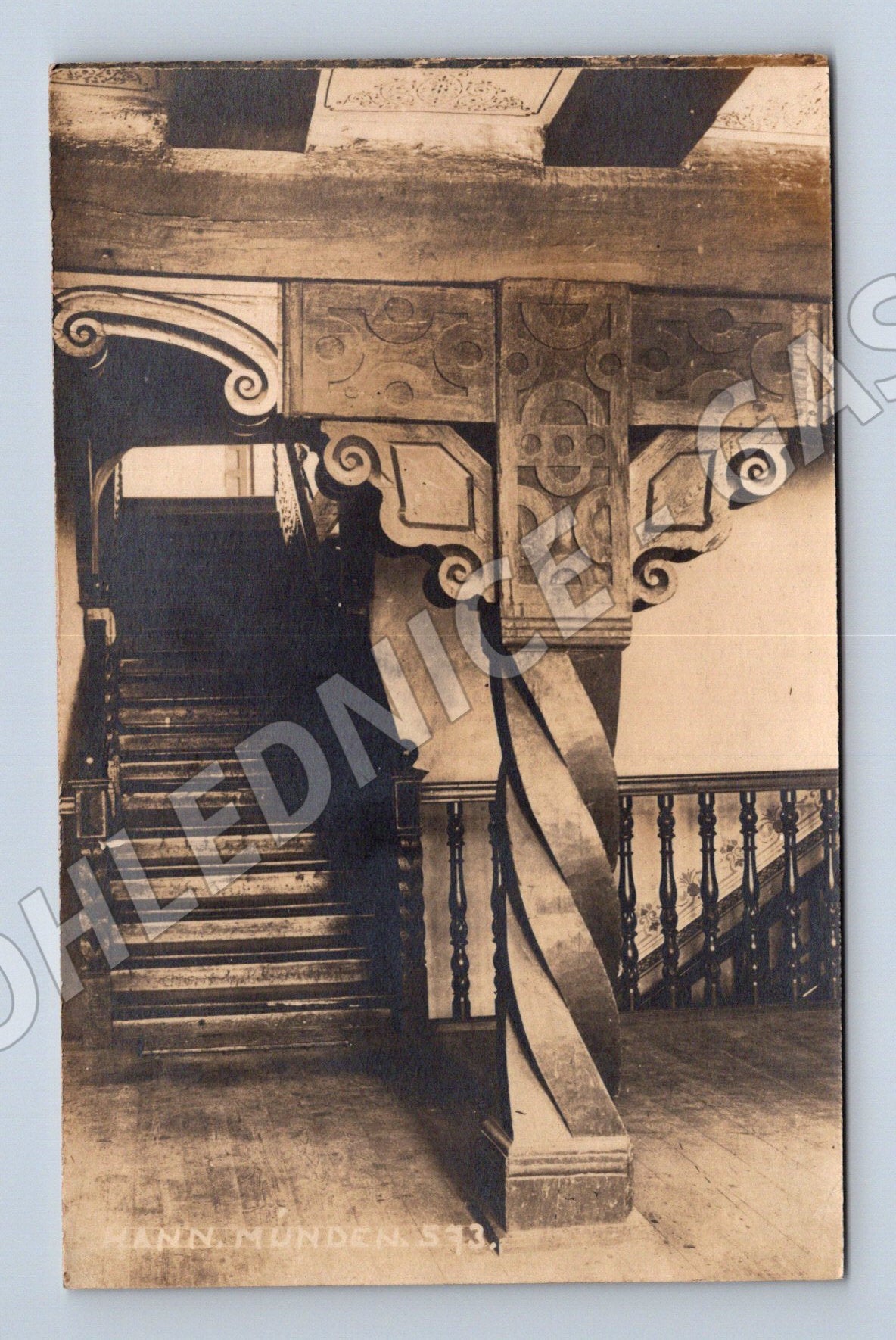 Starší pohlednice zobrazující detail zdobeného, točitého schodiště, pravděpodobně z interiéru historického hradu nebo zámku. Na levém okraji je popis HANNAHUNDE... a část čísla. Pohlednice je v dobrém sběratelském stavu, s mírným opotřebením odpovídajícím stáří. Zadní strana nenapsaná, lehká stopa po ušpinění. Vhodné pro sběratele pohlednic s tematikou českých historických památek nebo architektury. hann. münden 573