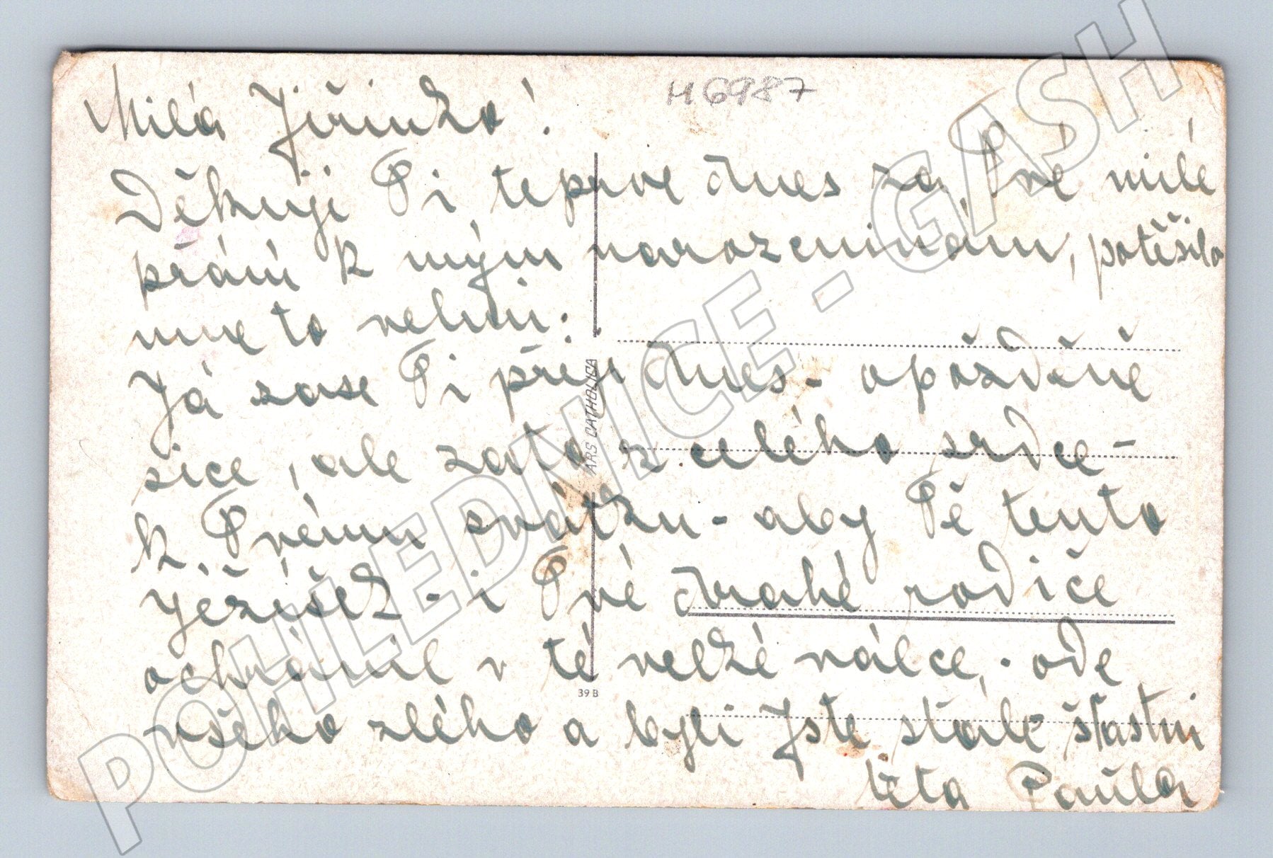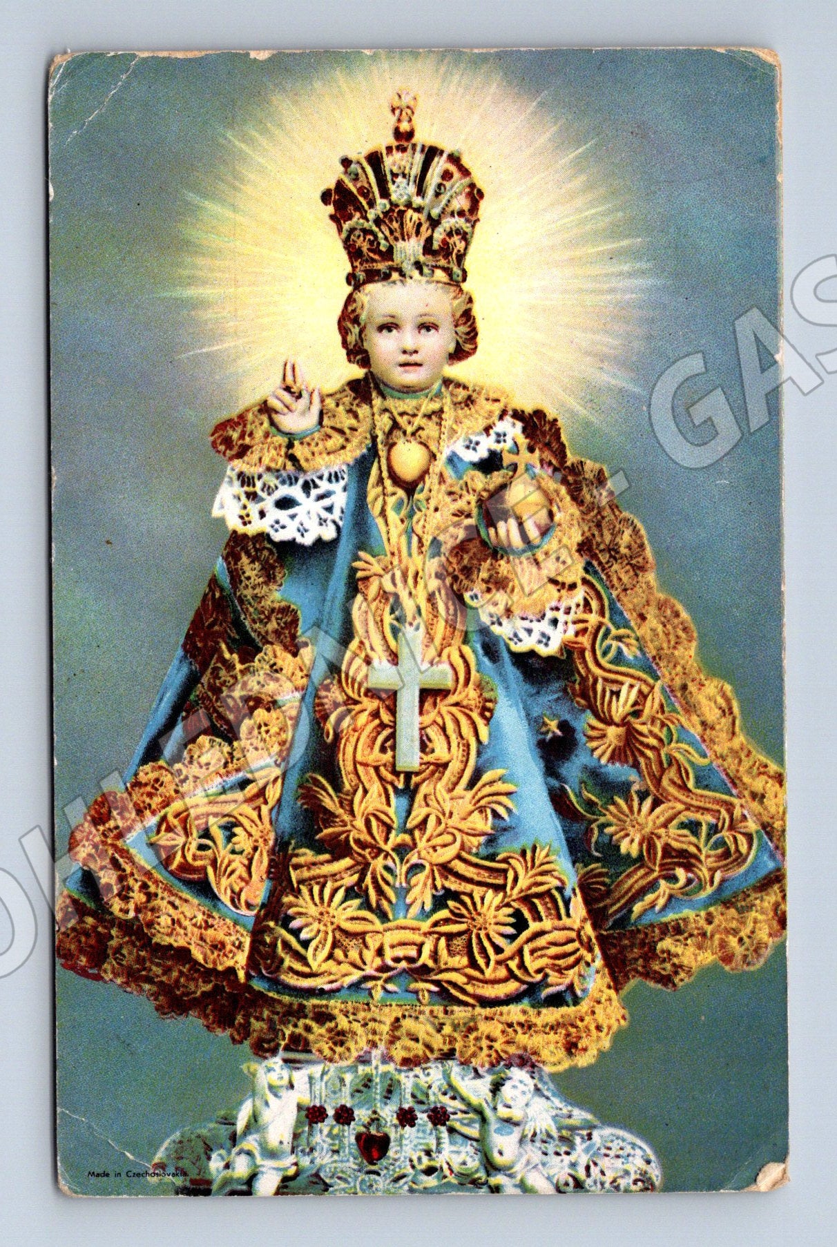 Originální pohlednice s barevným vyobrazením Pražského Jezulátka v bohatě zdobeném rouchu. Pohlednice pochází z první poloviny 20. století (malý formát do roku 1950). Na zadní straně naleznete ručně psaný vzkaz. Pohlednice je v zachovalém stavu, rohy jsou mírně otřepené, místy jsou patrné známky stáří a používání. Jedná se o sběratelsky zajímavý kus s náboženskou tématikou, vhodný do sbírky pohlednic z historické Prahy a tematických pohlednic z ČR.