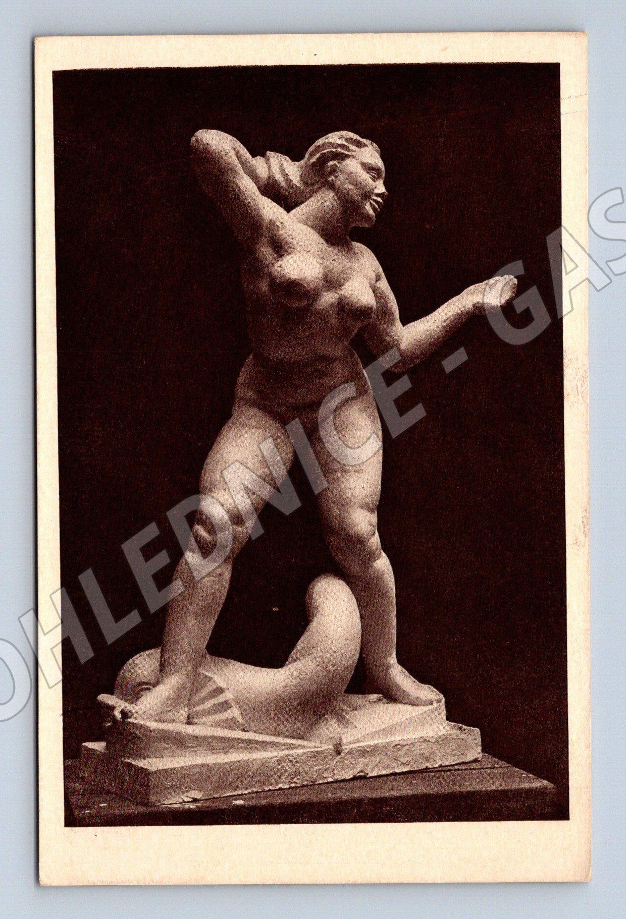 Historická pohlednice s reprodukcí slavné plastiky od Jana Štursy – Žena s delfínem (sádra, 1914). Jedná se o umělecký fotografický tisk plastiky významného českého sochaře. Zadní strana je nepsaná, s vytištěným popisem díla a jménem autora. Vydáno Štencovým grafickým kabinetem, Praha. Pohlednice je v zachovalém stavu, vhodná pro sběratele nebo milovníky umění. Rozměry klasického formátu, mírné známky stáří a opotřebení.