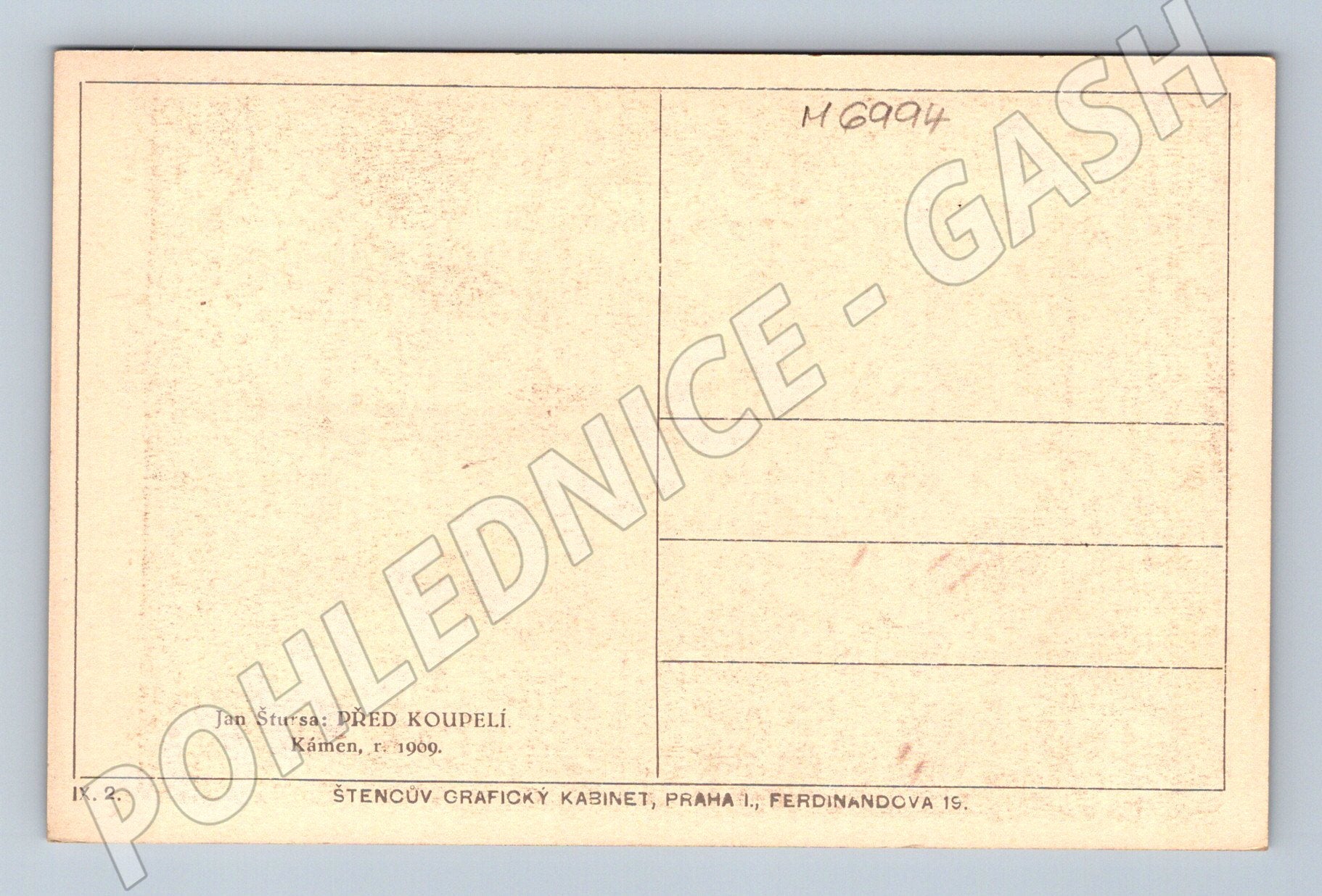 Pohlednice zobrazuje slavnou sochu Před koupelí od Jana Štursy. Pohlednice je v černobílém provedení, stav velmi dobrý, bez popisu a známky. Na zadní straně je uveden název díla a autor: Jan Štursa – PŘED KOUPELÍ, Kámen, r. 1909. Vydal Štencův grafický kabinet, Praha 1, Ferdinandova 19. Atraktivní sběratelský kousek, vhodný pro milovníky umění, malířství i sochařství. Původní tisk – historická pohlednice, vhodná do sbírky.