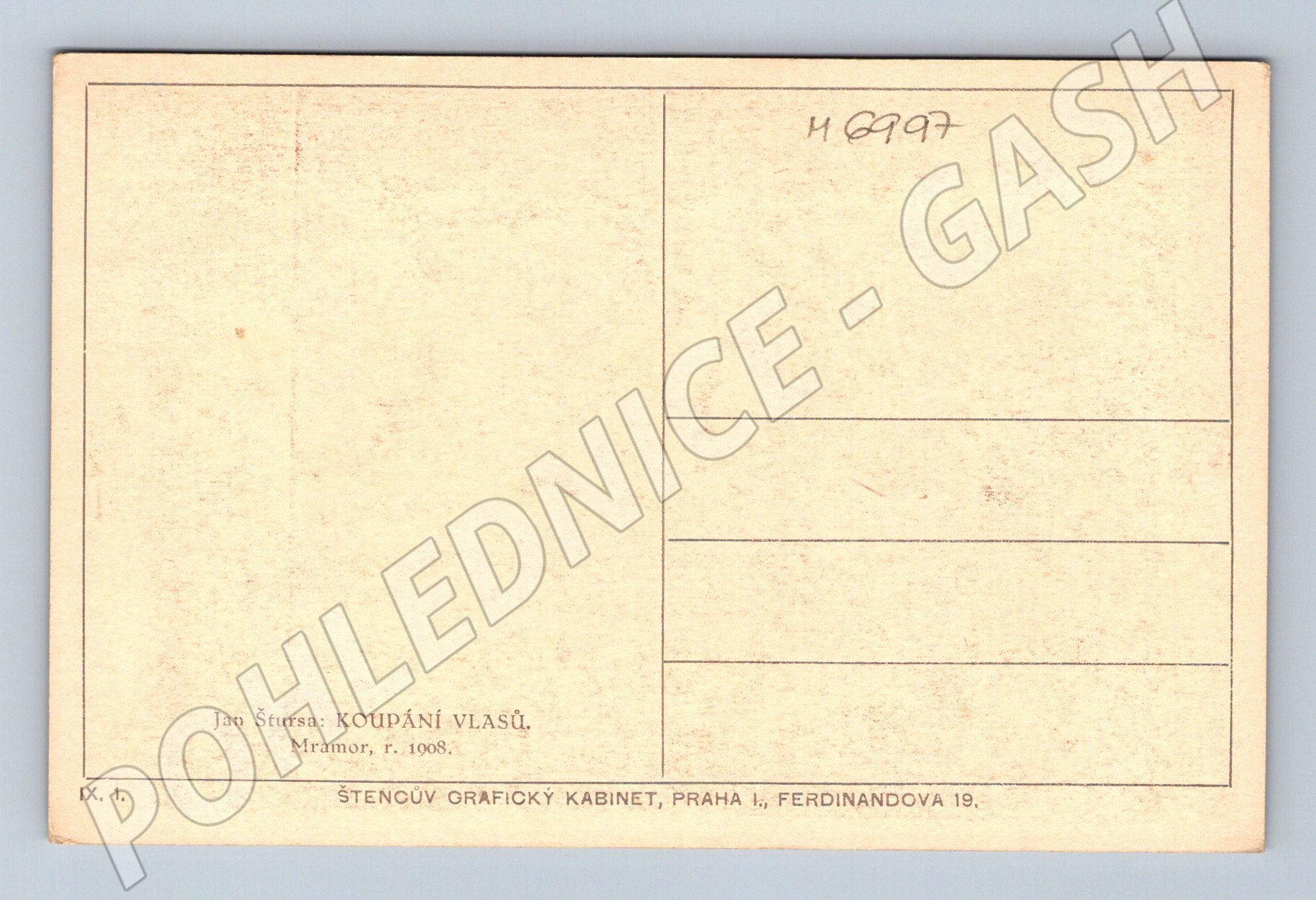 Originální historická pohlednice s uměleckou fotografií sochy od Jana Štursy s názvem Koupání vlasů (mramor, r. 1908). Pohlednici vydal Štencův grafický kabinet v Praze, Ferdinandova 19. Pohlednice je v dobře zachovalém sběratelském stavu, jedná se o zajímavý artefakt pro milovníky českého umění a sochařství. Rubová strana obsahuje název díla a autora, místo pro adresu a text je čisté. Skvělý přírůstek do sbírky pohlednic s uměleckou tematikou.
