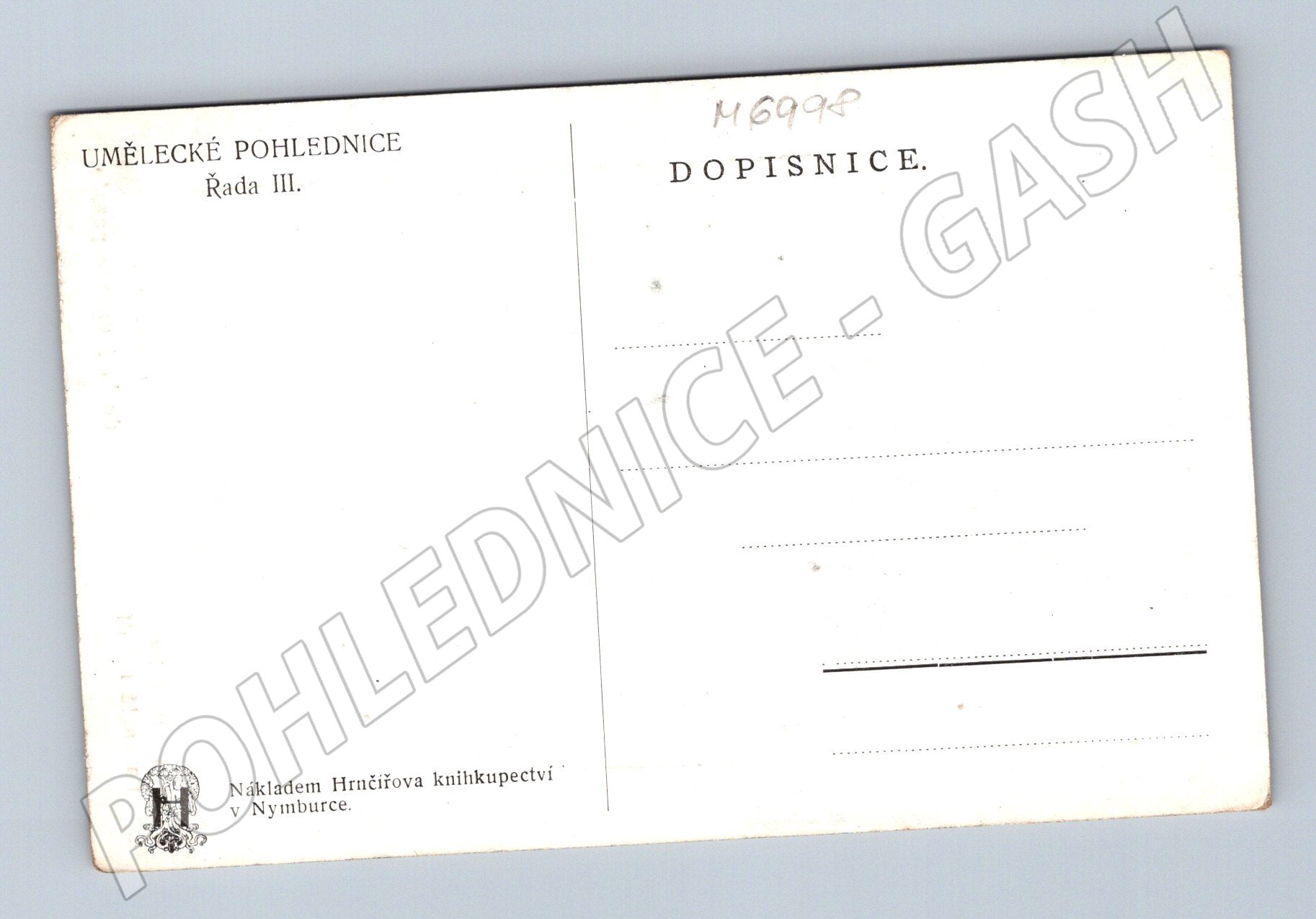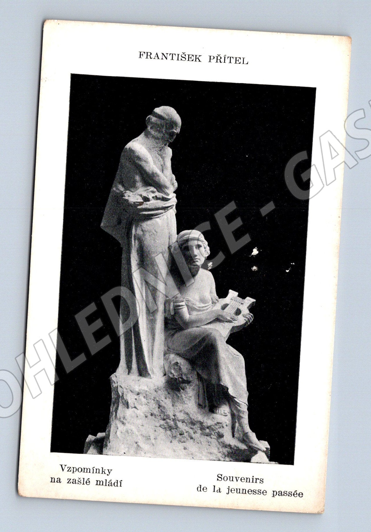 Umělecká pohlednice - FRANTIŠEK PŘÍTEL: Vzpomínky na zašlé mládí (Souvenirs de la jeunesse passée). Černobílá pohlednice z edice Umělecké pohlednice - Řada III. , vydaná knihkupectvím Hrnčíř v Nymburce. Na přední straně je reprodukce uměleckého díla, zobrazeného jako plastika dvou postav, evokující vzpomínky a emoce mládí. Pohlednice má typické znaky starších uměleckých vydání, včetně českého a francouzského názvu a informací o vydavateli. Vzadu je prostor na adresu a text, pohlednice nebyla použita. Stav odpovídá stáří, okraje mírně zažloutlé, jinak velmi dobře zachovalá. Vhodné pro sběratele historických pohlednic nebo zájemce o umělecké motivy.