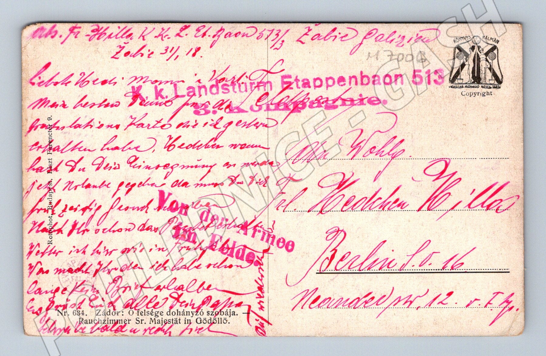 Zámek Gödöllő –kuřácký salon, polní pošta K.K. Landsturm Etappenbaon 513 3 kompagnie