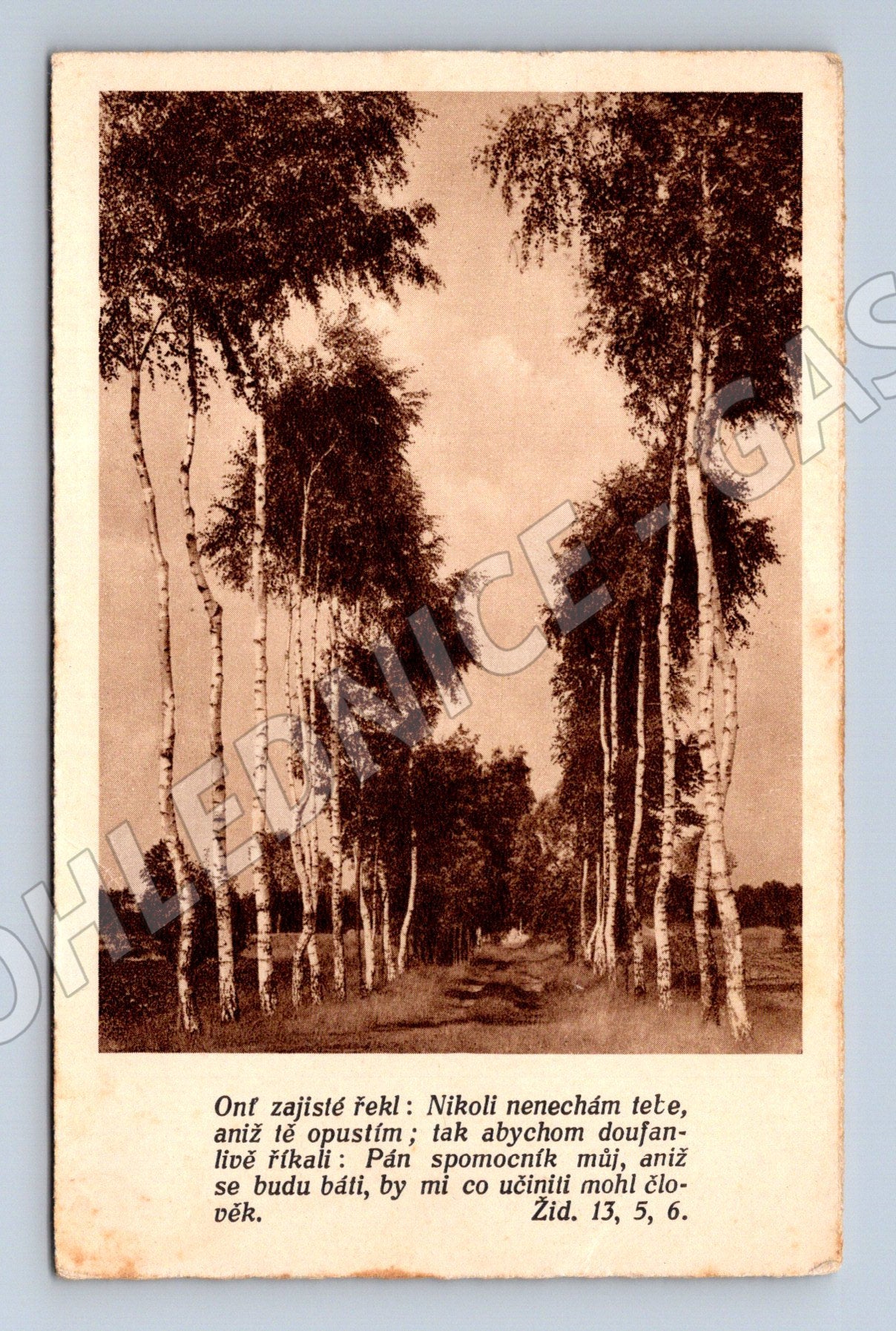 Originální stará pohlednice z období první poloviny 20. století, zobrazující březový les ve stylu černobílé fotografie. Na přední straně je český biblický citát ze Židům 13, 5. 6.: „Onť zajisté řekl: Nikoli nenechám tebe, aniž tě opustím...“ Pohlednice byla zaslána a je popsána ručně psaným textem na zadní straně, který dokládá její historickou autenticitu. Na okraji je mírné opotřebení odpovídající stáří pohlednice. Raritní sběratelský kousek vhodný do sbírky nebo jako originální dekorace.